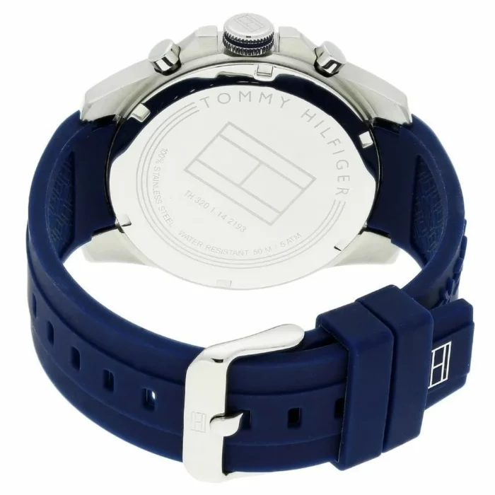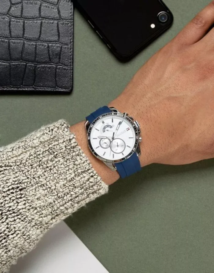 ساعة تومي هيلفيغر للرجال اصلية موديل (ديكر) Decker 1791349 لون ابيض واستيك سيليكون مطاط لون ازرق.