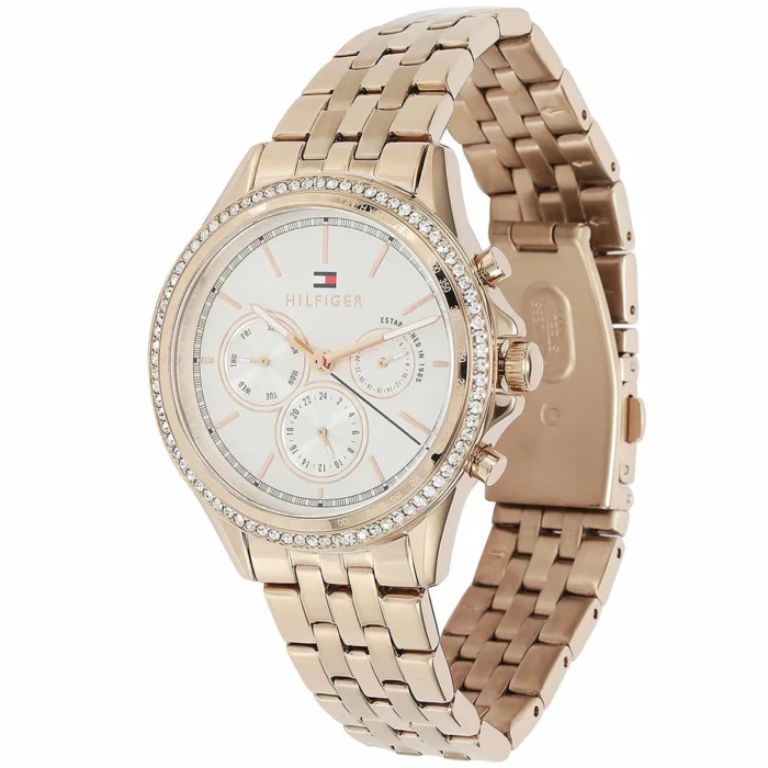 ساعة تومي هيلفيغر Tommy Hilfiger للنساء أصلية موديل (اري) 1781978 Ari لون ابيض و استيك معدن ستانلس ستيل لون روز جولد.