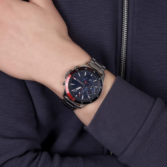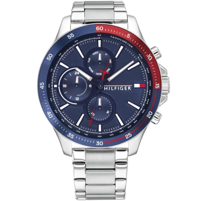 ساعة تومي هيلفيغر للرجال أصلية موديل Bank 1791718 لون ازرق و استيك معدن ستانلس لون فضي.