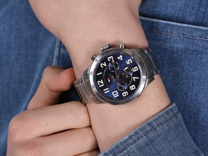 ساعة تومي هيلفيغر للرجال اصلية موديل (ترينت) Trent 1791053 لون ازرق واستيك معدن ستانلس لون فضي.