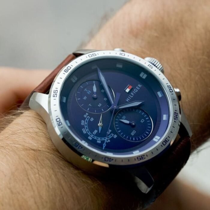 ساعة تومي هيلفيغر للرجال أصلية موديل (ترينت) Trent 1791807 لون ازرق و استيك جلد طبيعي لون بني.