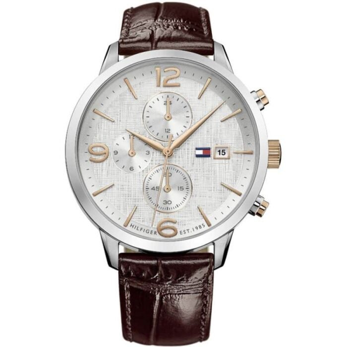 ساعة تومي هيلفيغر للرجال اصلية موديل 1710360بلون ابيض واستيك جلد لون بني