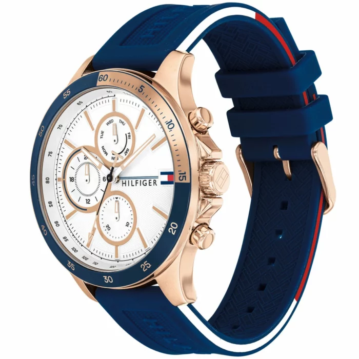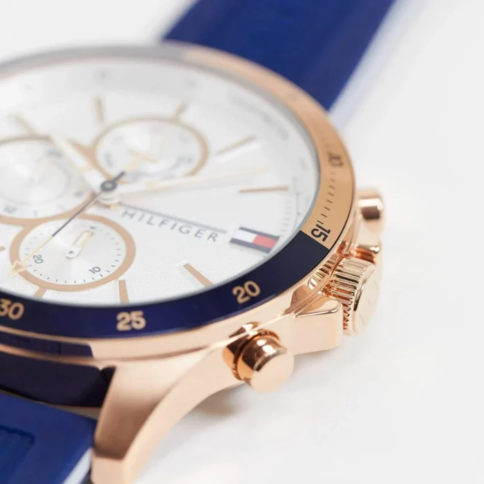 ساعة تومي هيلفيغر للرجال أصلية موديل (بنك) Bank 1791778 لون ابيض و استيك سيليكون مطاط لون ازرق.