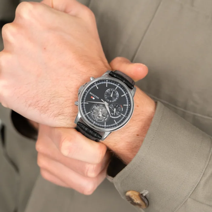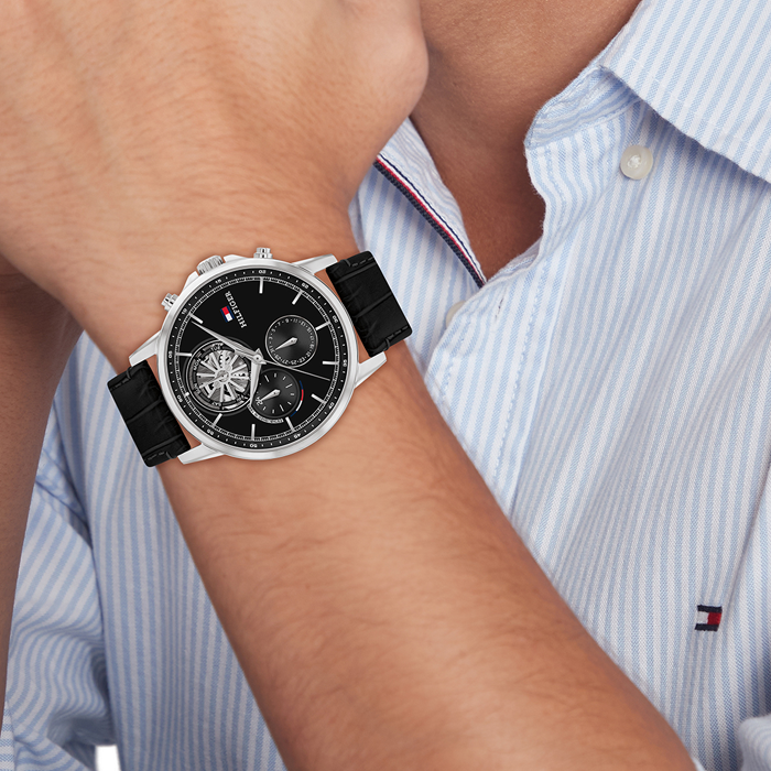 ساعة تومي هيلفيغر Tommy Hilfiger للرجال أصلية موديل 1710605 لون اسود و استيك جلد طبيعي لون اسود.