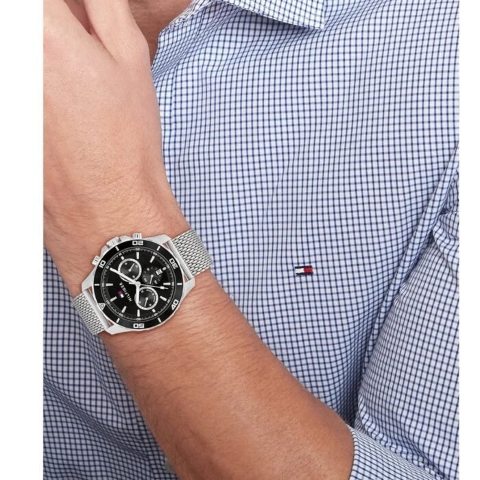 ساعة تومي هيلفيغر Tommy Hilfiger للرجال أصلية موديل 1792092 لون اسود و استيك معدن ستانلس لون فضي.