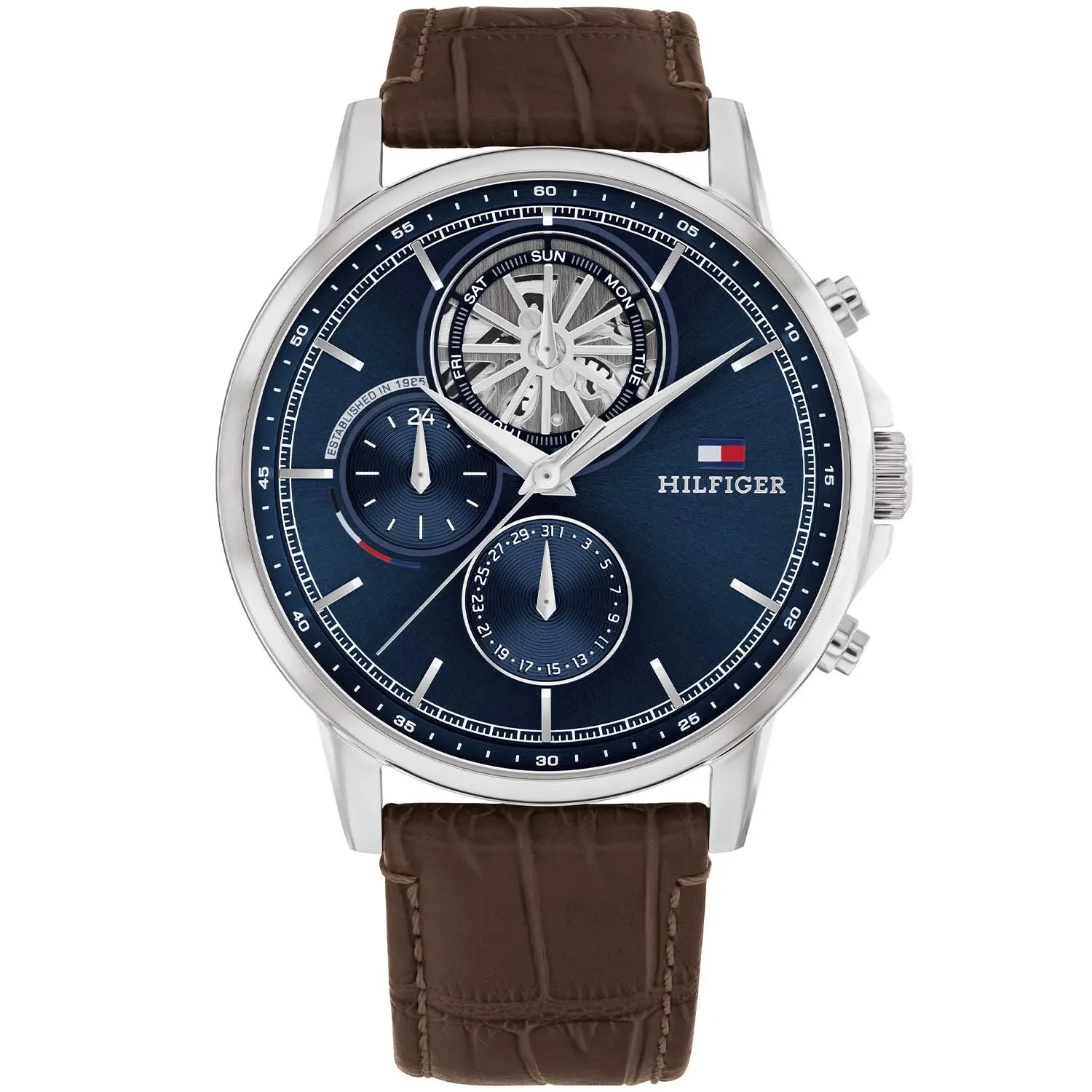 ساعة تومي هيلفيغر Tommy Hilfiger للرجال أصلية موديل 1710629 لون ازرق و استيك جلد طبيعي لون بني.