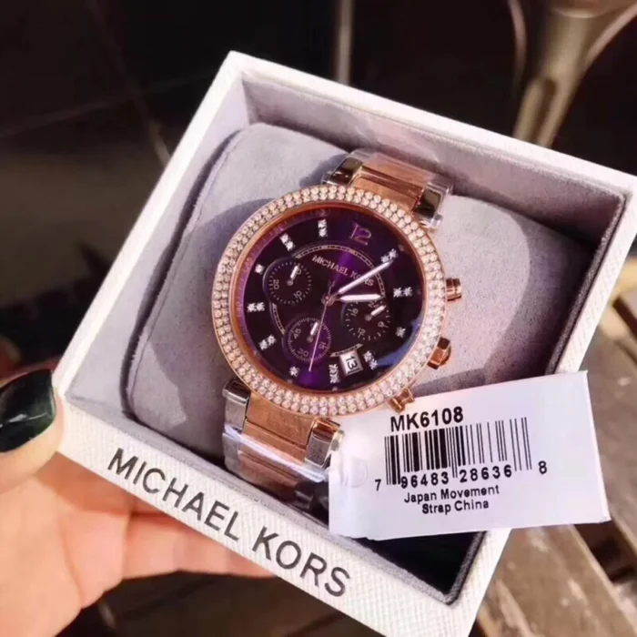 ساعة مايكل كورس Michael Kors للنساء أصلية موديل Parker MK6108 لون ارجواني و استيك معدن ستانلس لون فضي * روز جولد.