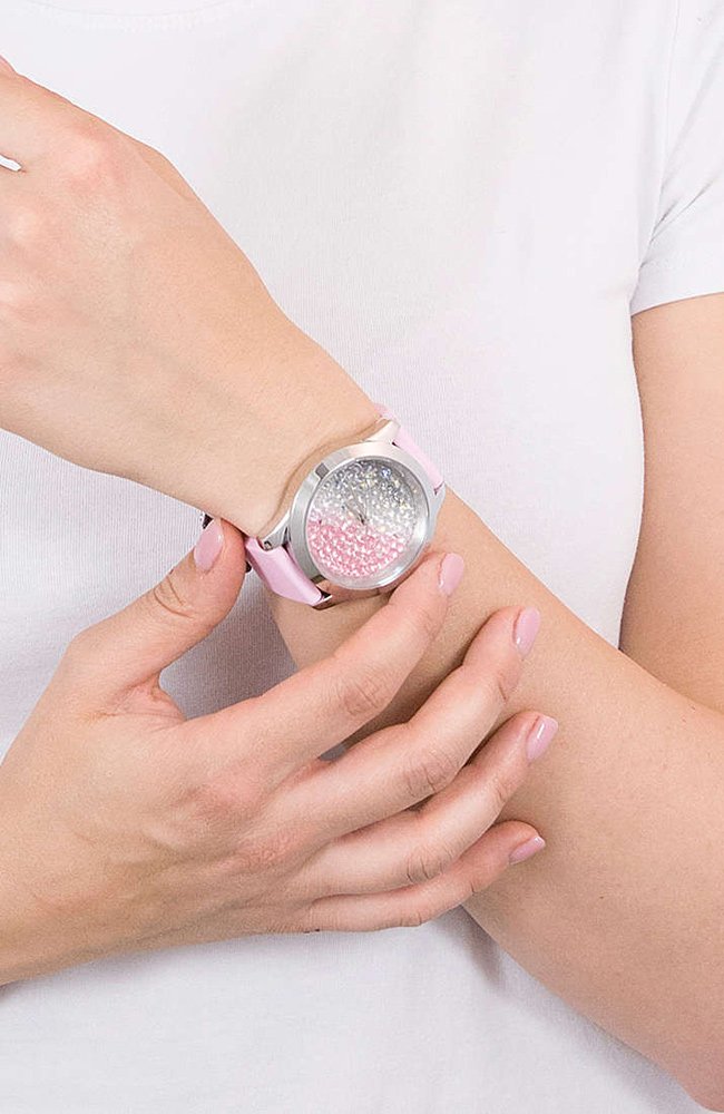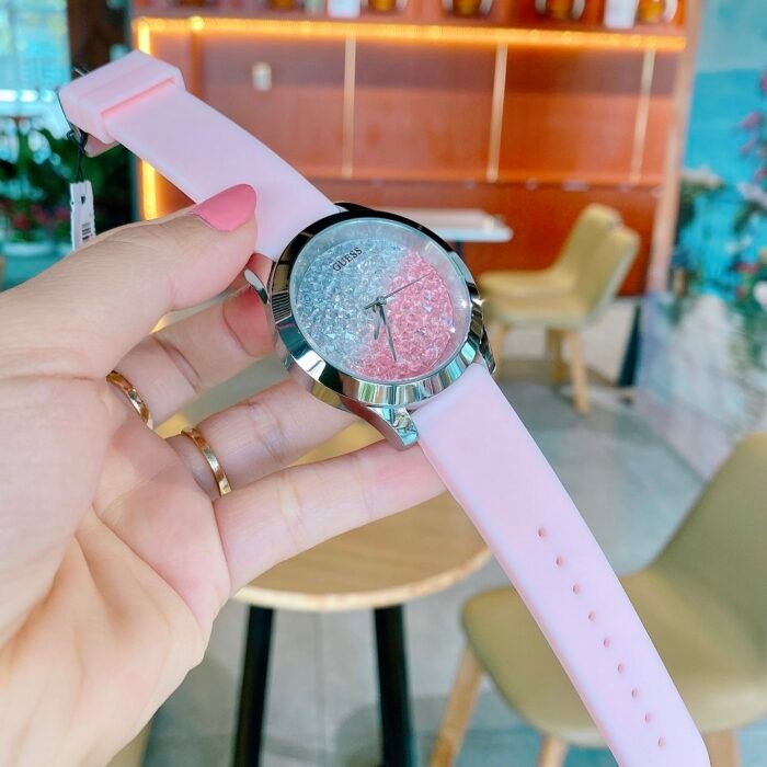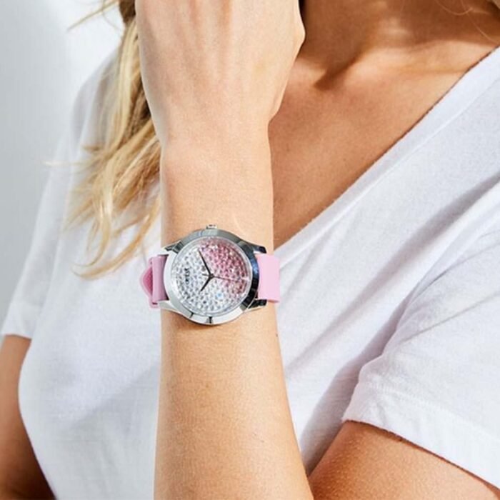 ساعة جيس Guess للنساء أصلية موديل W1223L1 لون وردي * كريستال و استيك سيليكون مطاط لون وردي.