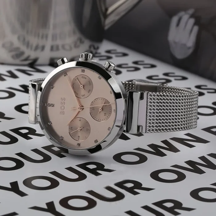ساعة هوجو بوس Hugo Boss للنساء أصلية موديل 1502625 Flawless لون روز جولد و استيك معدن ستانلس لون فضي.