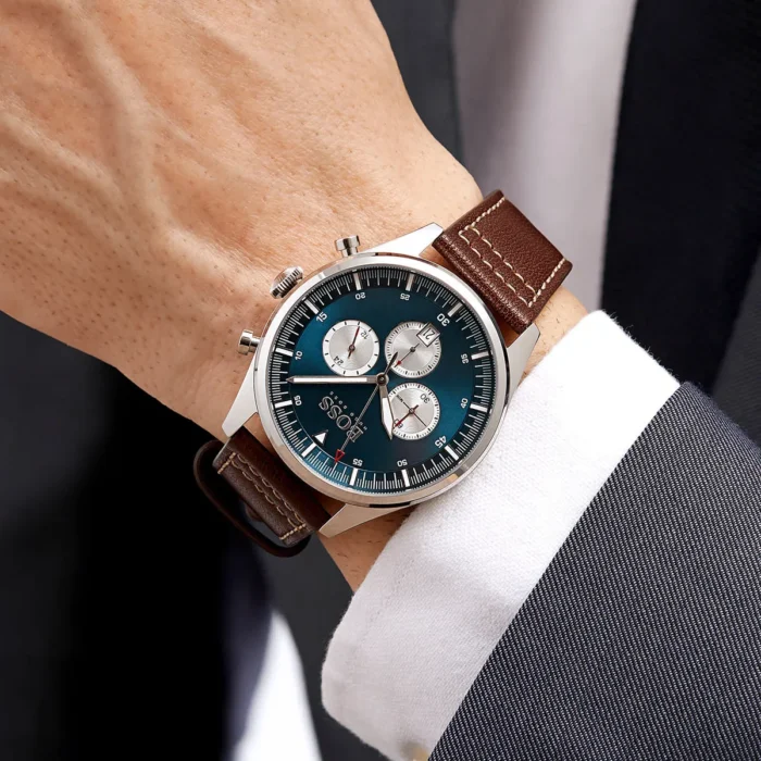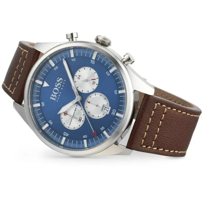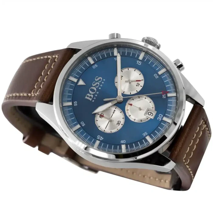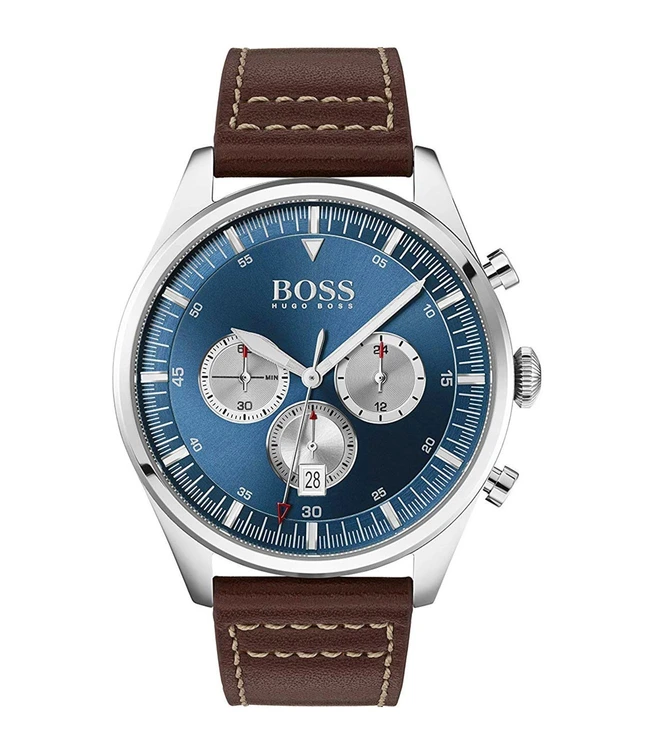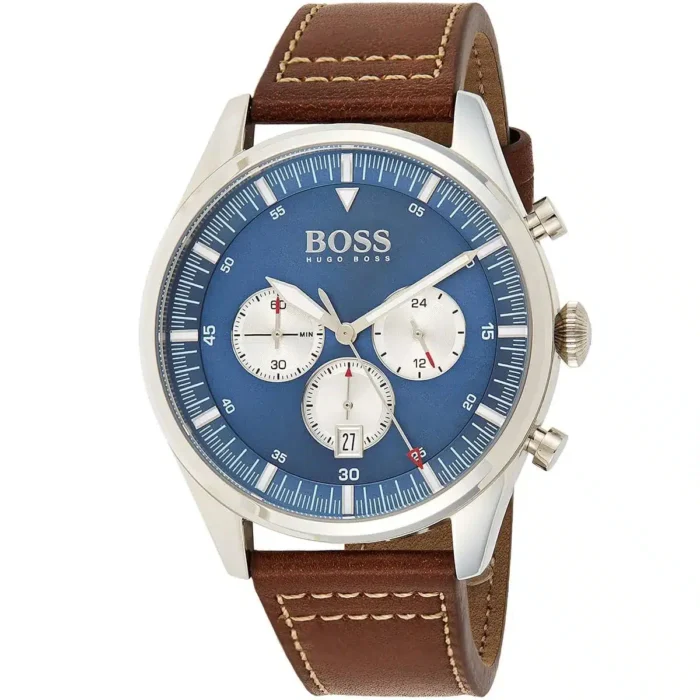 ساعة هوجو بوس Hugo Boss للرجال أصلية موديل 1513709 Pioneer لون ازرق و استيك جلد طبيعي لون بني.