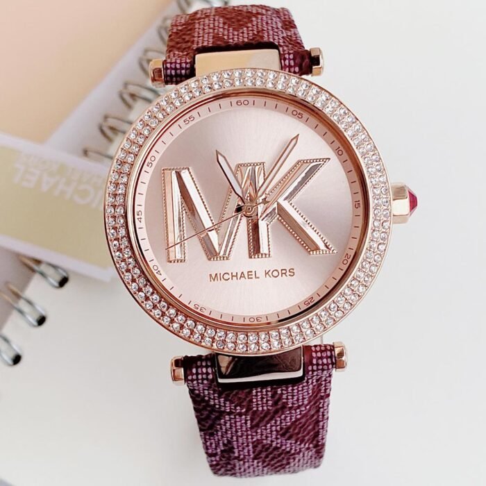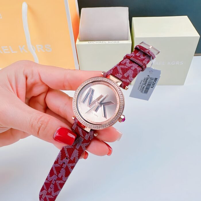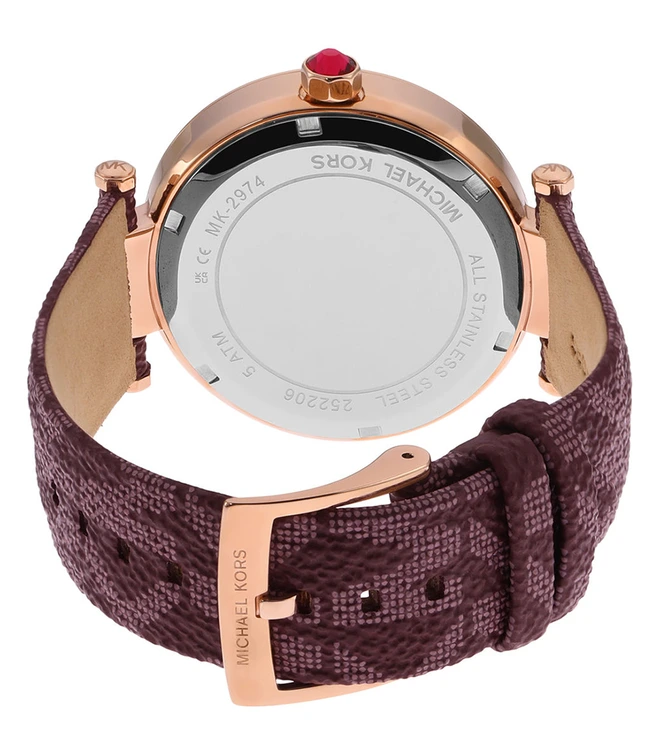 ساعة مايكل كورس للنساء أصلية موديل MK2974 لون روز جولد و استيك جلد طبيعي لون احمر.