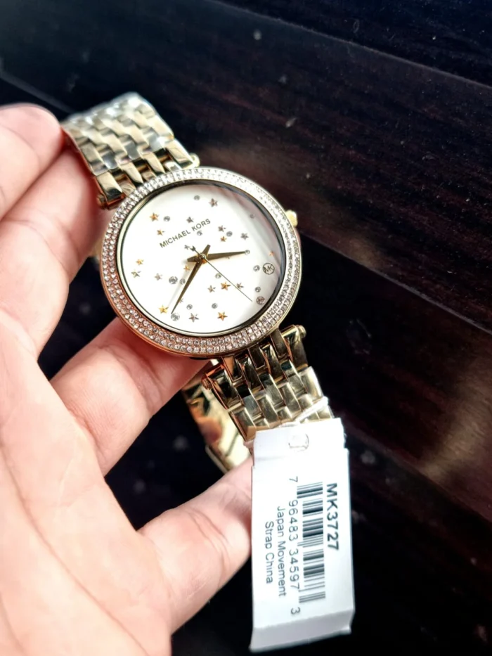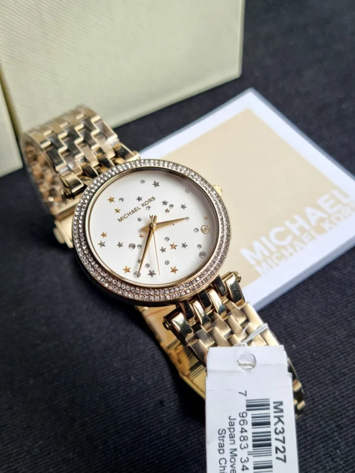 ساعة مايكل كورس للنساء أصلية موديل Mk3727 لون ابيض و اوستيك معدن ستانلس لون ذهبي.