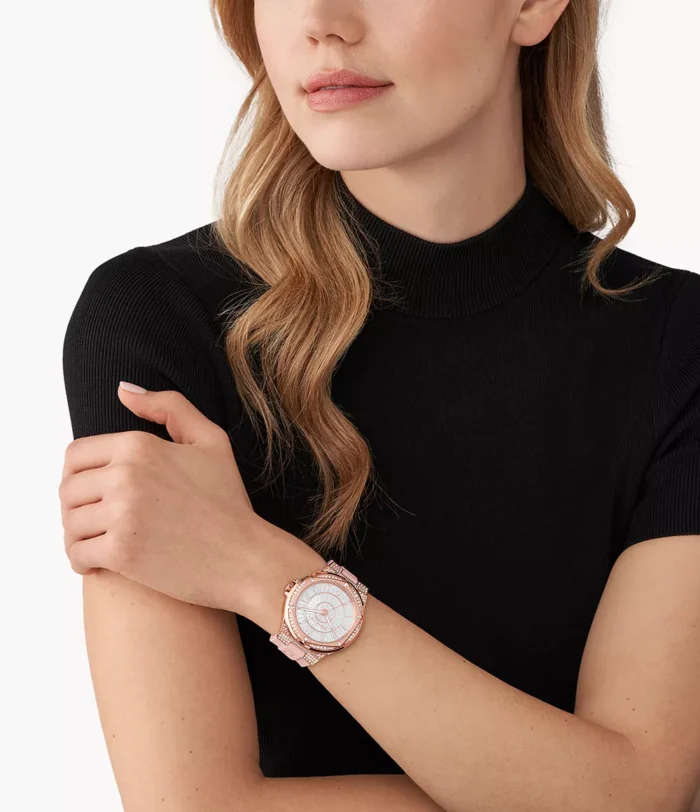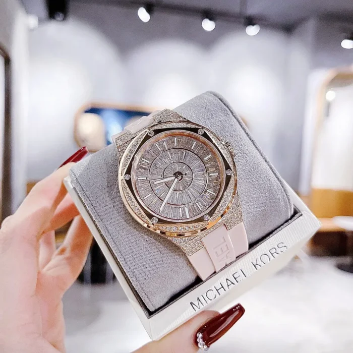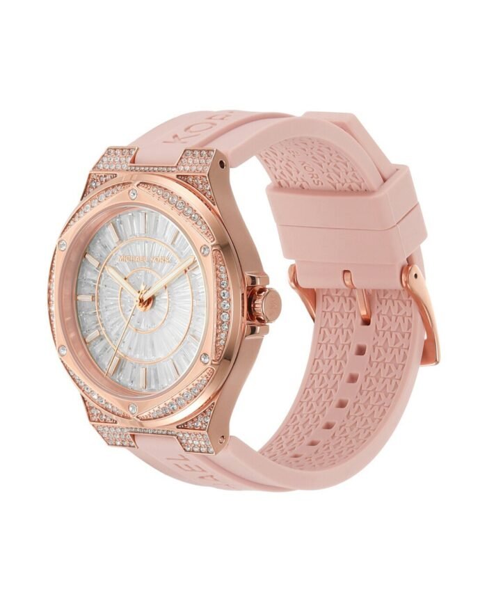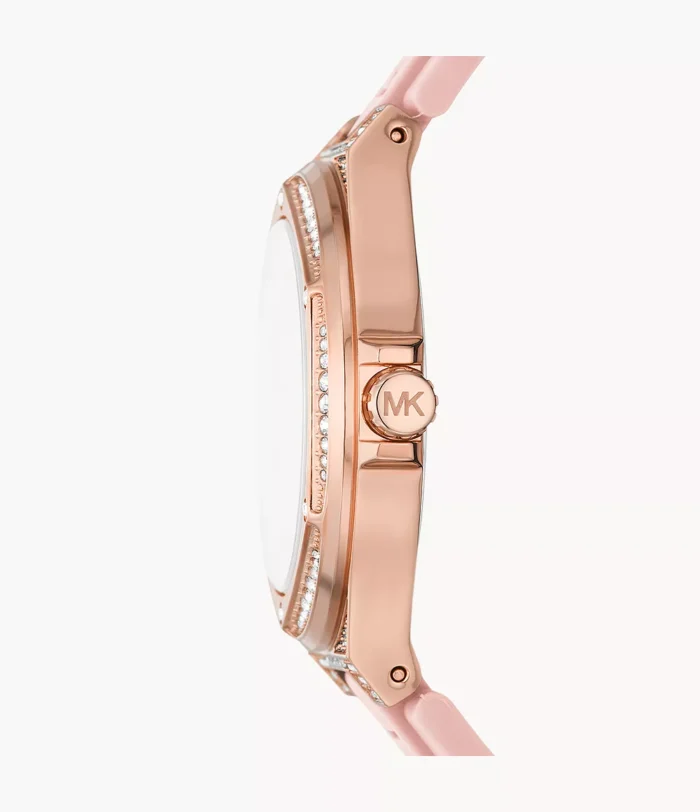 ساعة مايكل كورس اصلية للنساء موديل ( Lennox لينوكس ) MK7334 لون فضي و اوستيك سيليكون مطاط لون وردي.