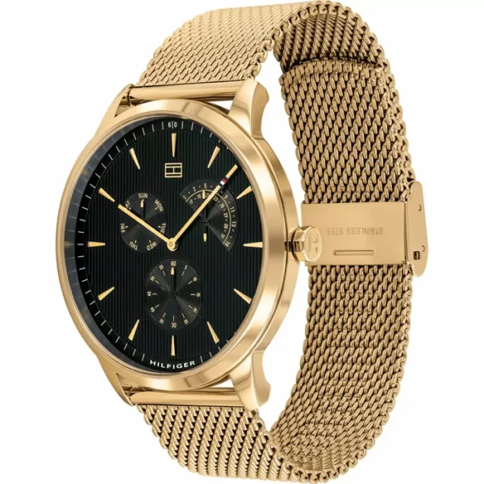 ساعة تومي هيلفيغر اصليه للرجال موديل 1710386 لون اسود واوستيك معدن ستانلس لون ذهبي.