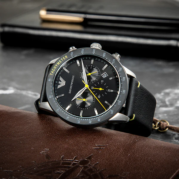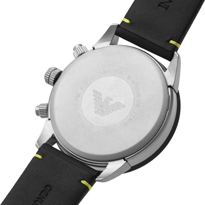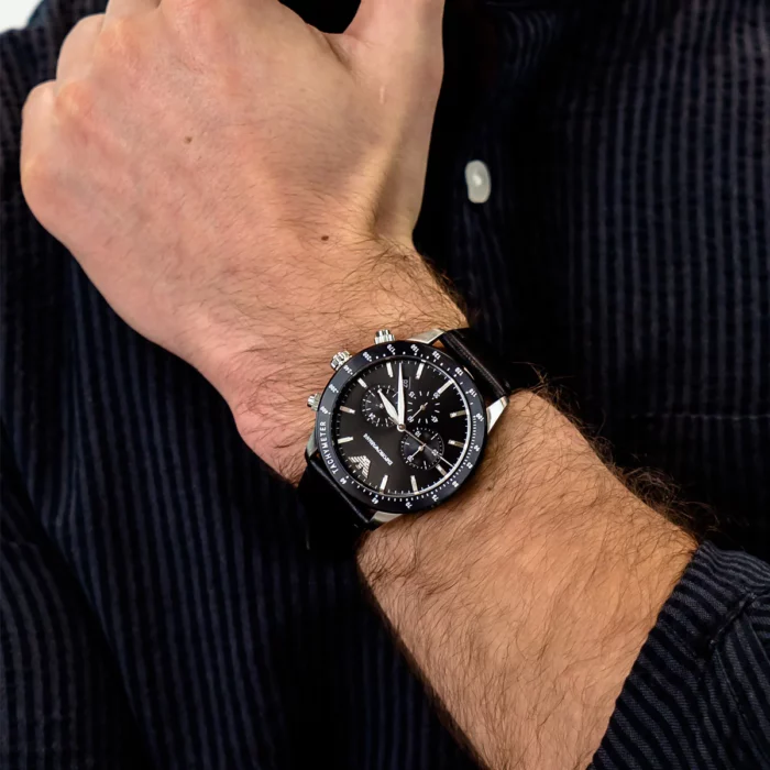 ساعة امبوريو ارماني للرجال أصلية موديل Mario AR11325 بلون اسود و استيك جلد طبيعي بلون اسود.