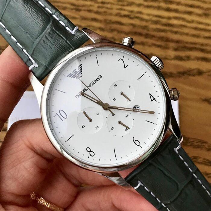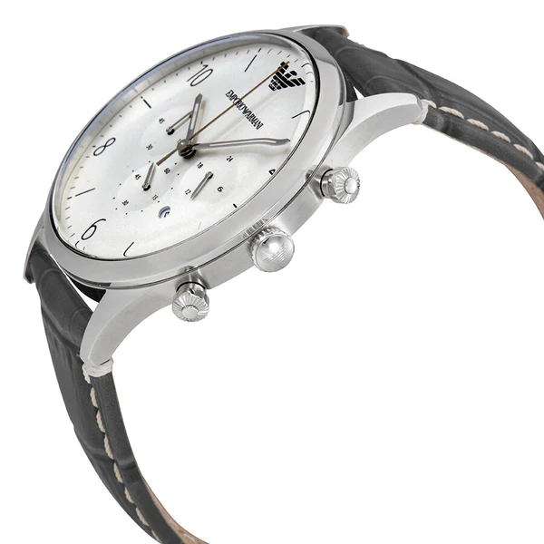 ساعة إمبوريو أرماني للرجال اصليه موديل AR1861 بلون ابيض و استيك جلد طبيعي لون اسود.