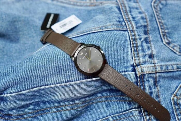 ساعة امبوريو ارماني للرجال اصلية موديل Retro AR2483 لون اسود و استيك جلد طبيعي لون بني.