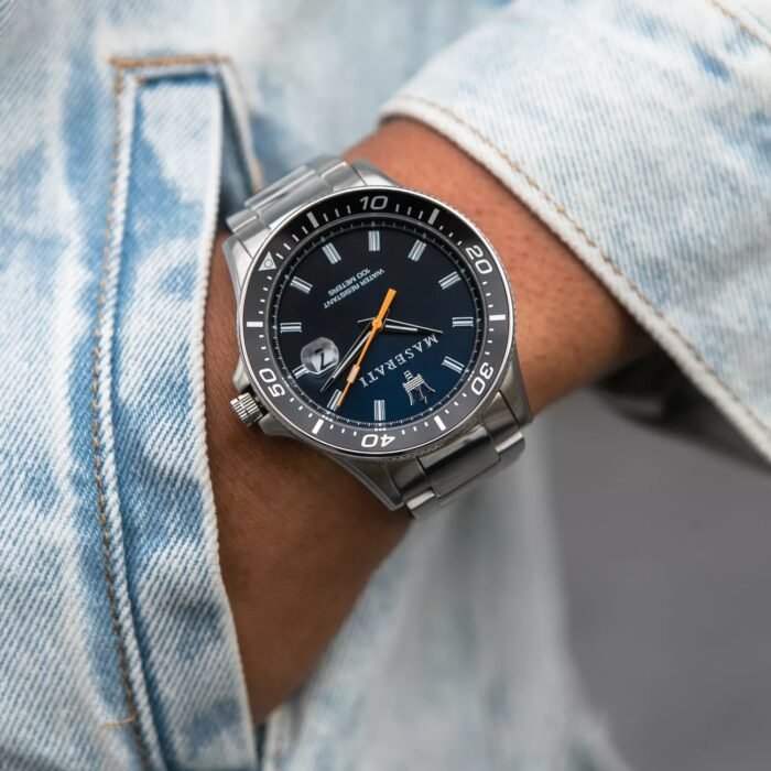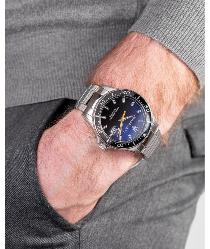 ساعة مازيراتي للرجال أصلية موديل R8853140001 Sfida لون ازرق و استيك معدن ستانلس لون فضي.
