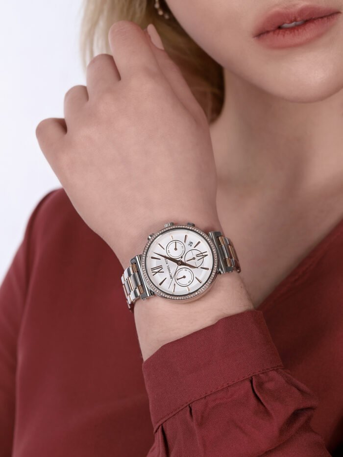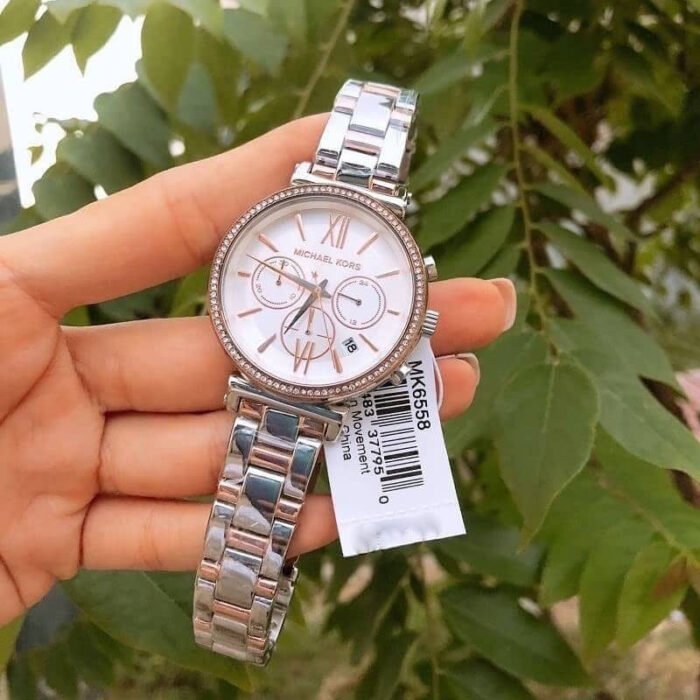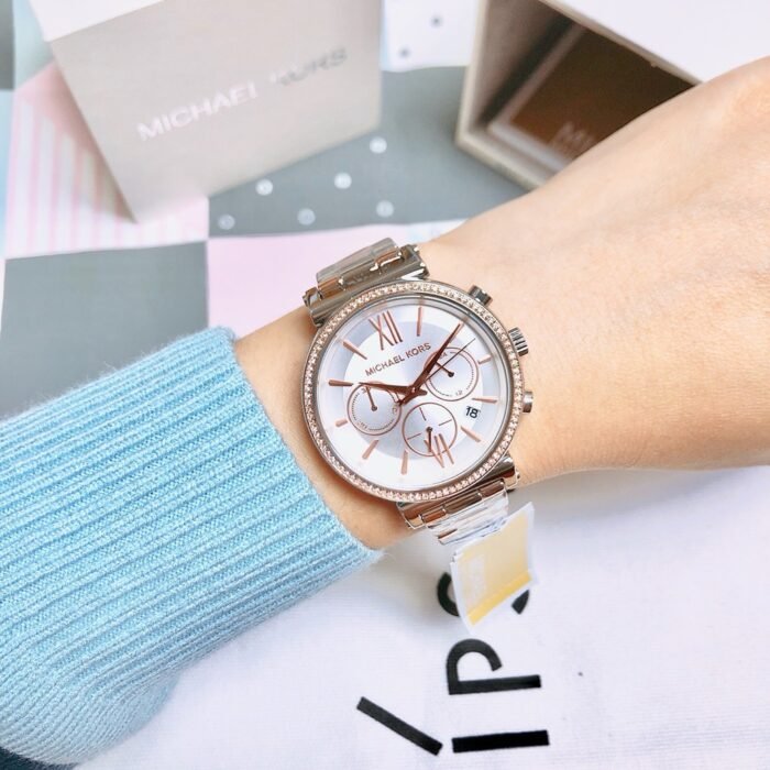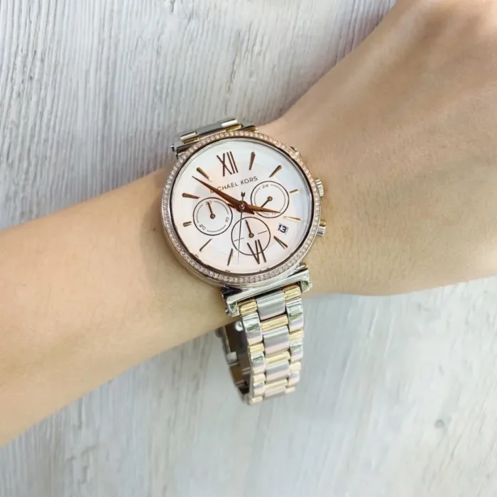 ساعة مايكل كورس للنساء اصلية موديل Sofie MK6558 لون ابيض واستيك معدن ستانلس لون فضي * روز جولد.