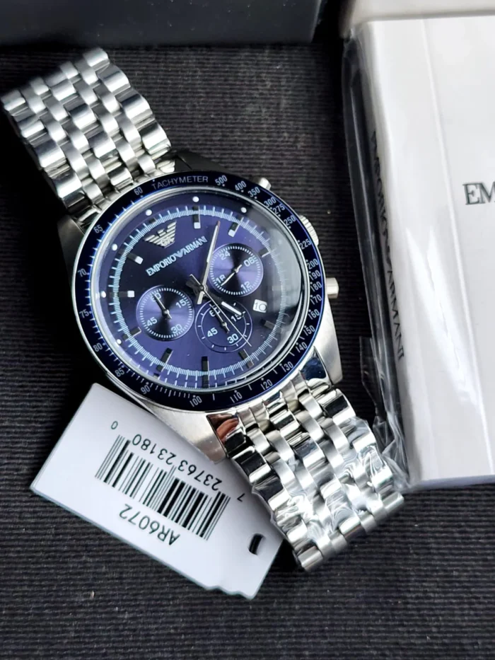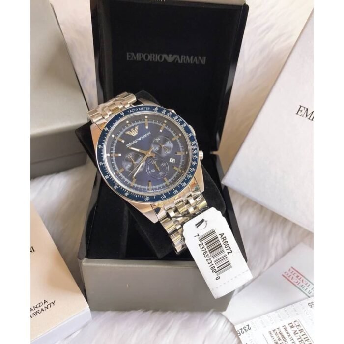 ساعة امبوريو ارماني للرجال اصلية موديل Tazio AR6072 لون ازرق واستيك معدن ستانلس لون فضى.