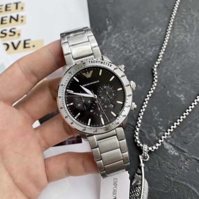 ساعة امبوريو ارماني للرجال أصلية موديل Mario AR11241 لون اسود و استيك معدن ستانلس لون فضي.