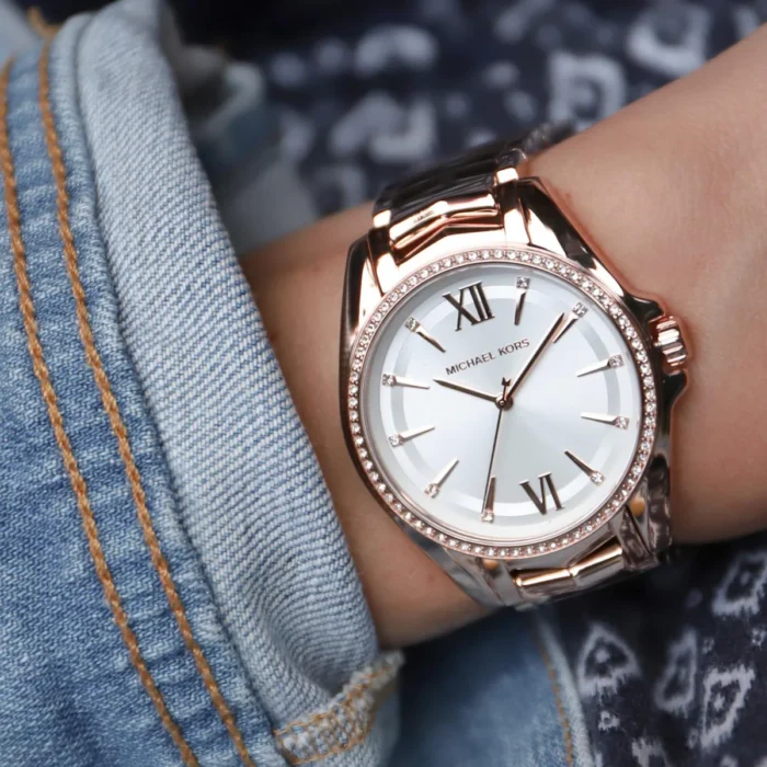 ساعة مايكل كورس للنساء اصلية موديل Whitney MK6694 لون ابيض واستيك معدن ستانلس لون روز جولد.