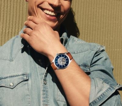 ساعة فوسيل للرجال اصلية موديل Townsman ME3154 لون ازرق واستيك جلد طبيعي لون بنى.