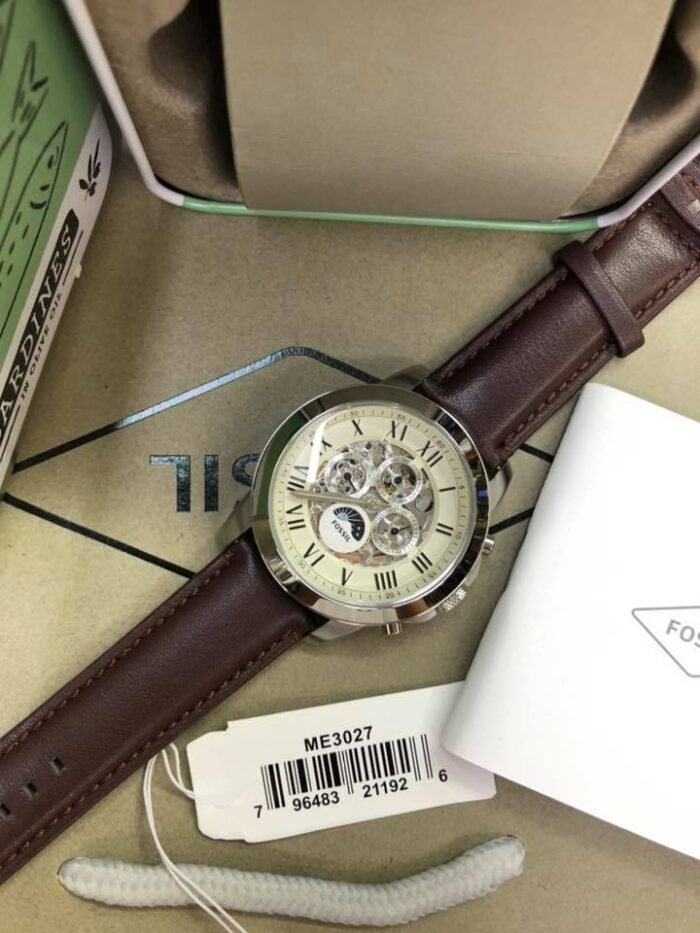 ساعة فوسيل للرجال اصلية موديل Grant me3027 لون ابيض واستيك جلد طبيعي لون بنى.