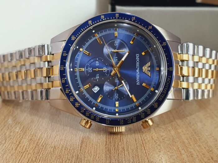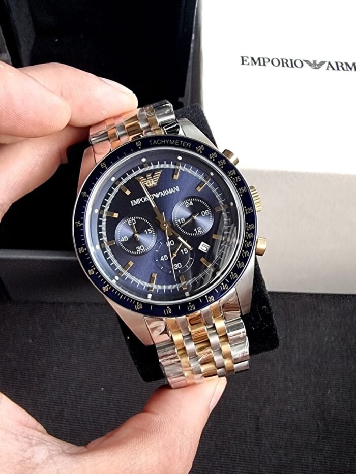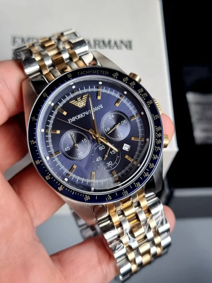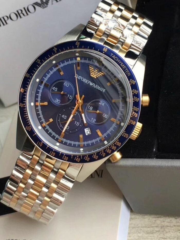 ساعة امبوريو ارماني للرجال اصلية موديل Tazio AR6088 لون ازرق واستيك معدن ستانلس لون فضى * ذهبي.
