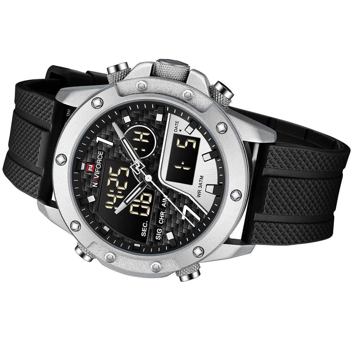 ساعة يد نافي فورس Naviforce NF 9221 S B B رجالي أصلية موديل ( NF9221 ) نظرية و رقمية WR 3BAR بلون اسود و استيك سيليكون مطاط بلون اسود احصل عليها الآن من SAN CAN للساعات – SAN CAN Watches