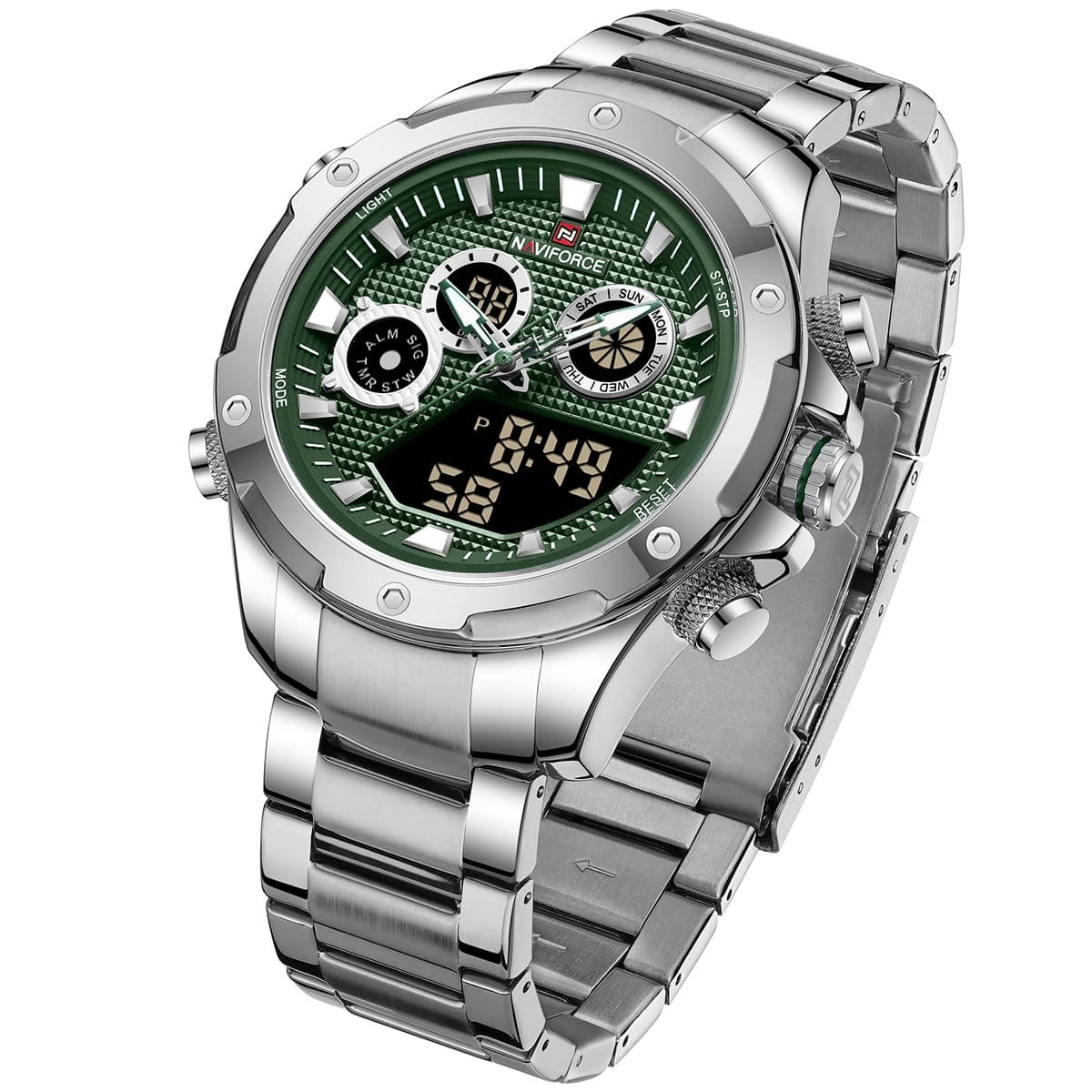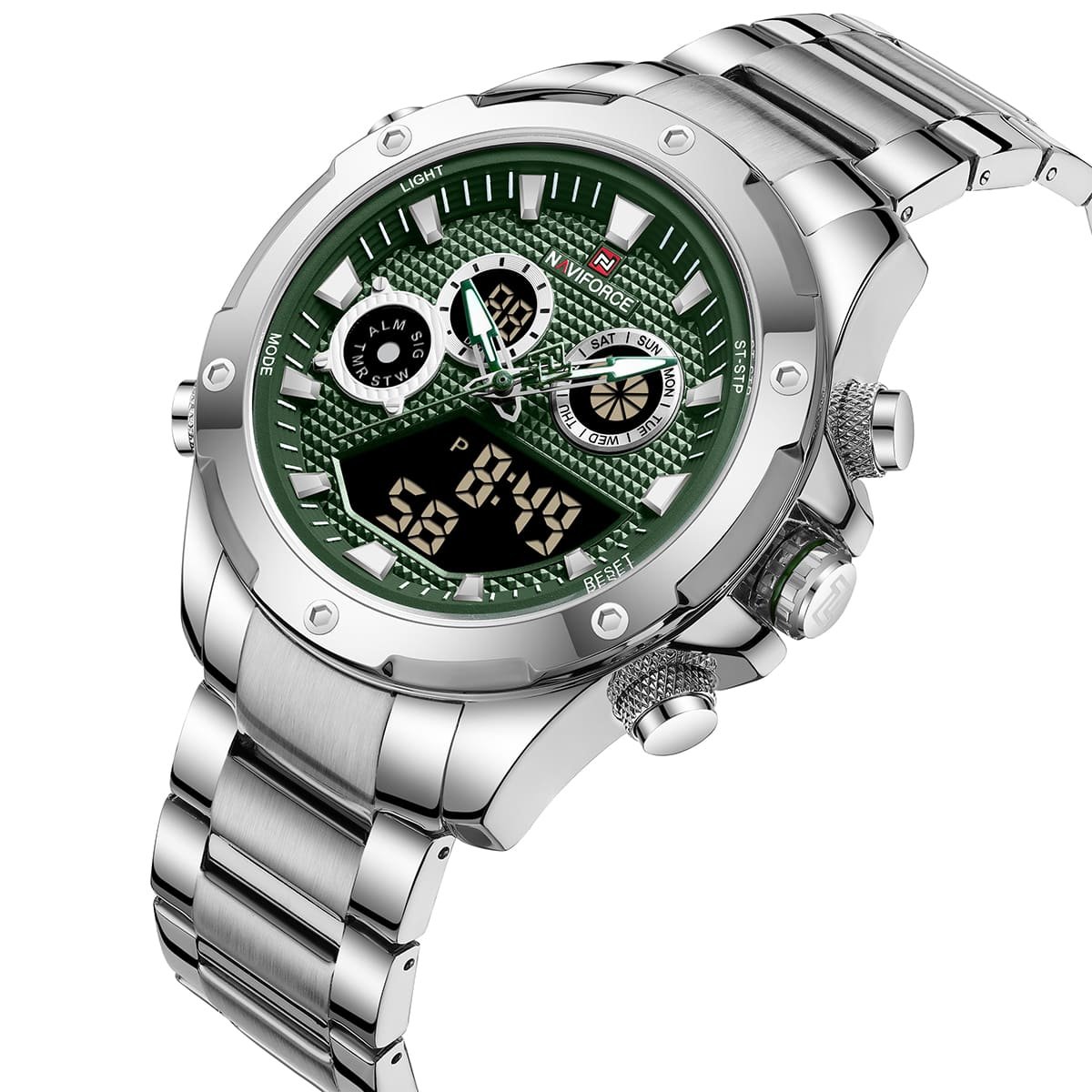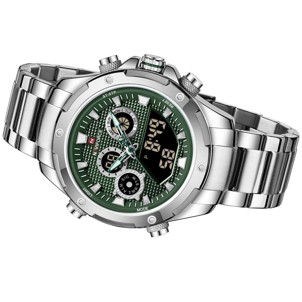 ساعة يد نافي فورس Naviforce NF 9217 S GN رجالي أصلية موديل ( NF9217 ) نظرية و رقمية بلون اخضر و استيك ستانلس ستيل بلون فضي احصل عليها الآن من SAN CAN للساعات – SAN CAN Watches