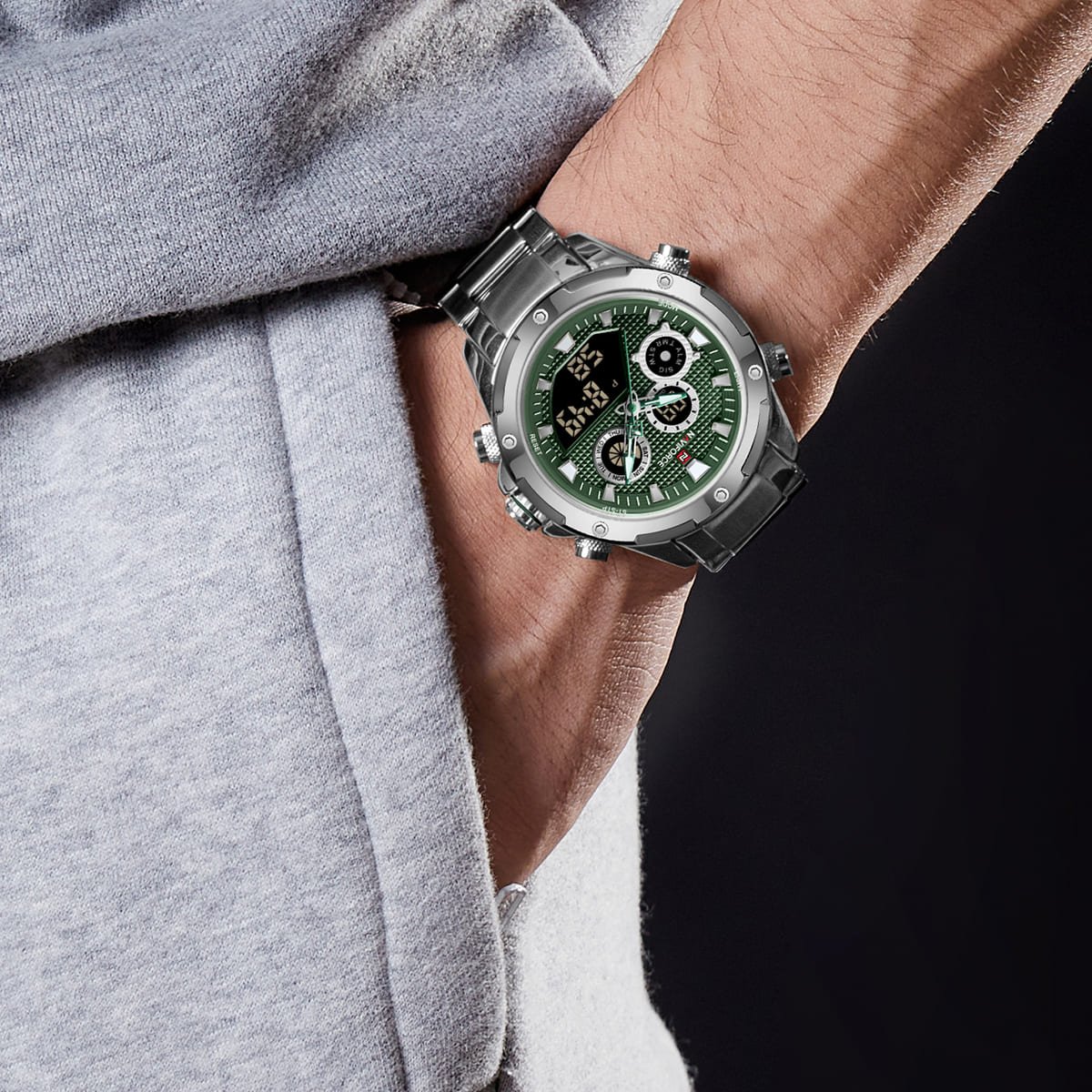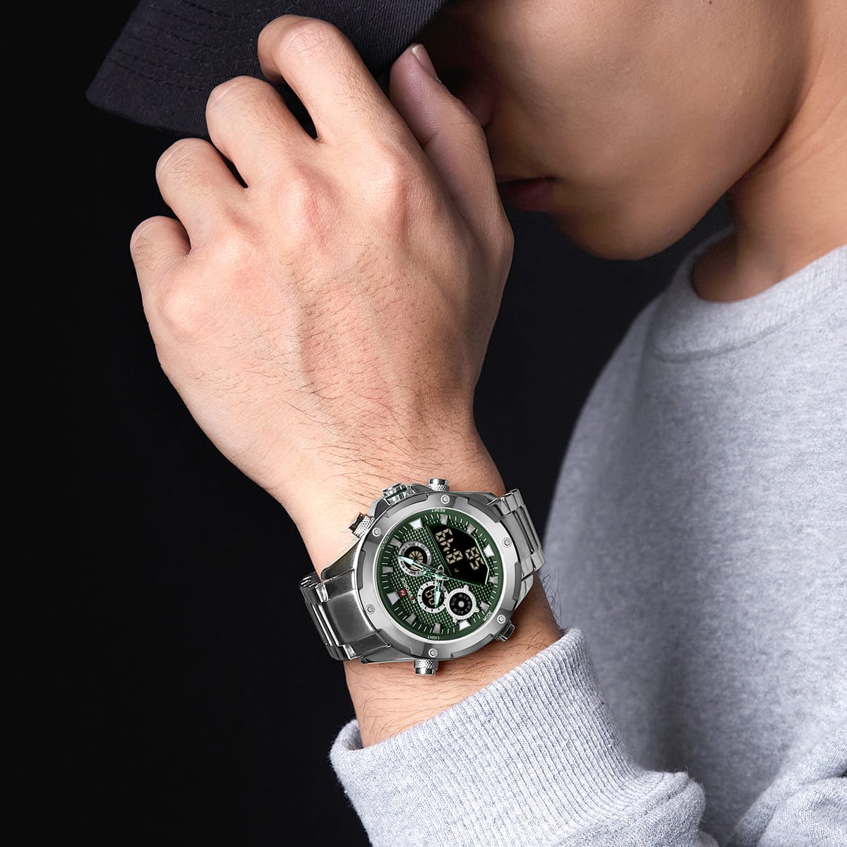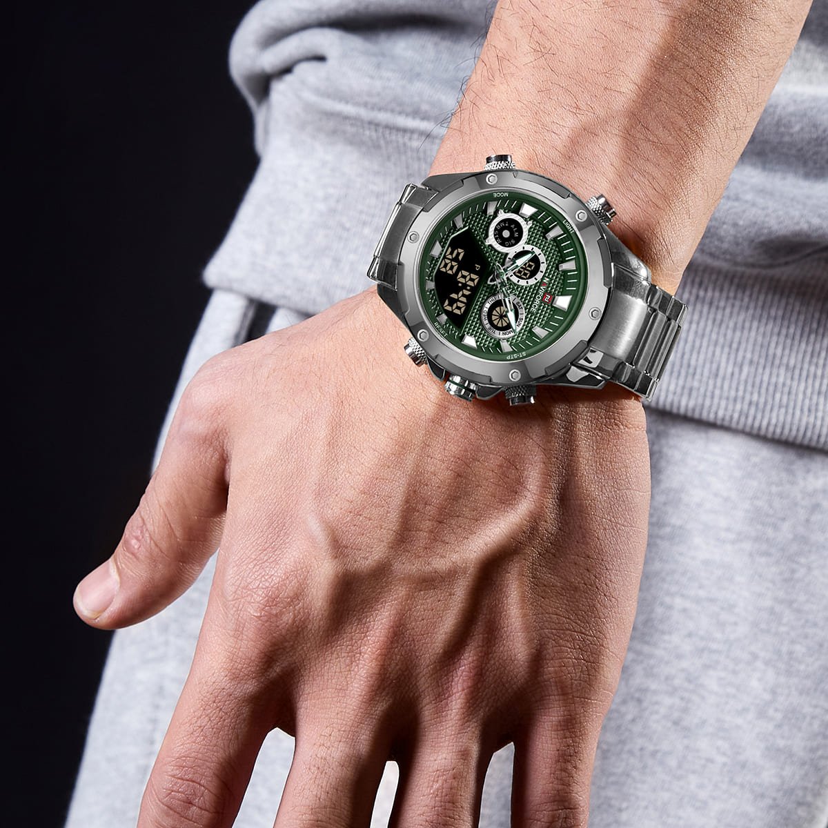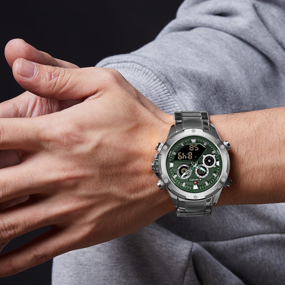 ساعة يد نافي فورس Naviforce NF 9217 S GN رجالي أصلية موديل ( NF9217 ) نظرية و رقمية بلون اخضر و استيك ستانلس ستيل بلون فضي احصل عليها الآن من SAN CAN للساعات – SAN CAN Watches