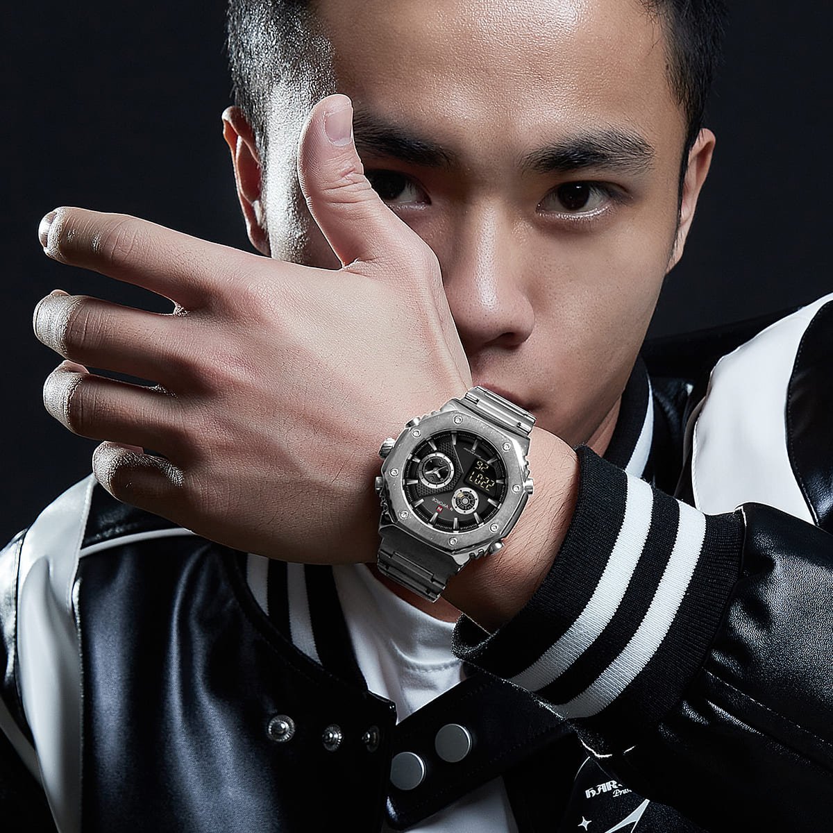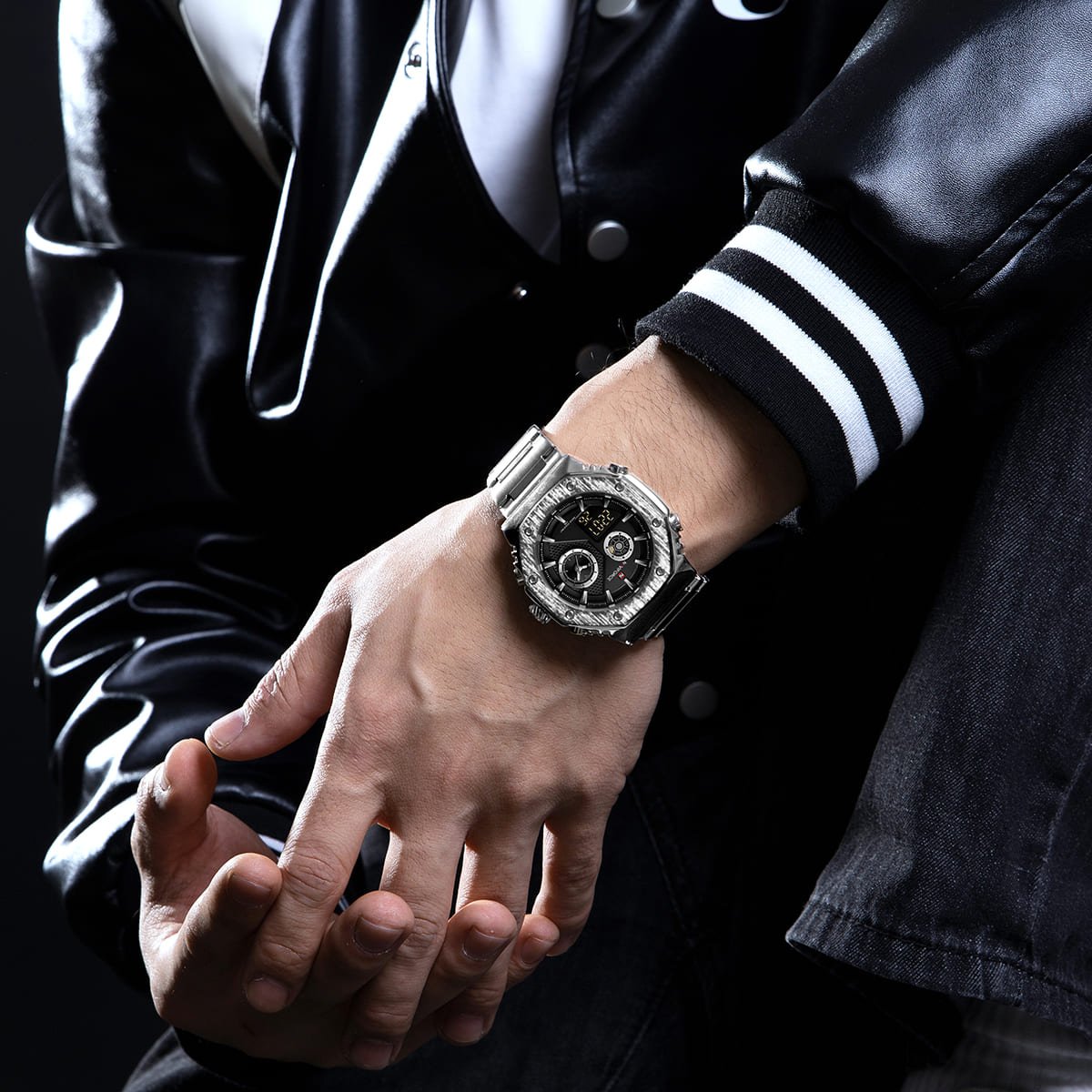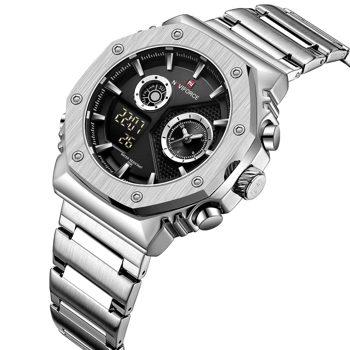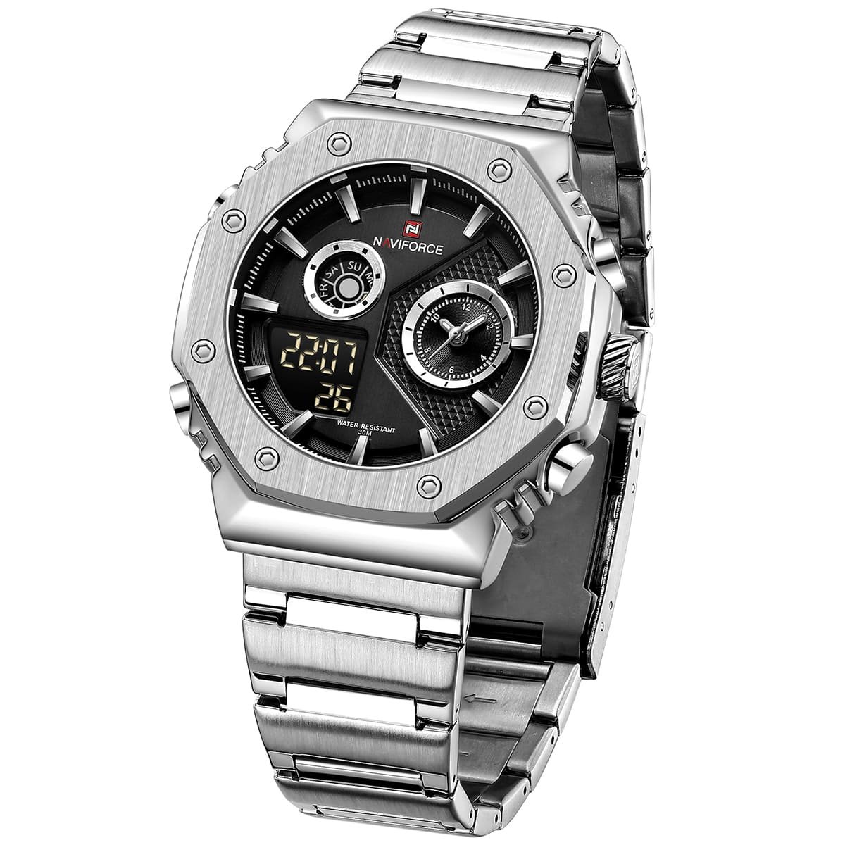 ساعة يد نافي فورس Naviforce NF 9216S S B رجالي أصلية موديل ( NF9216S ) نظرية و رقمية Water Resistant-30M بلون اسود و استيك ستانلس ستيل بلون فضي احصل عليها الآن من SAN CAN للساعات – SAN CAN Watches