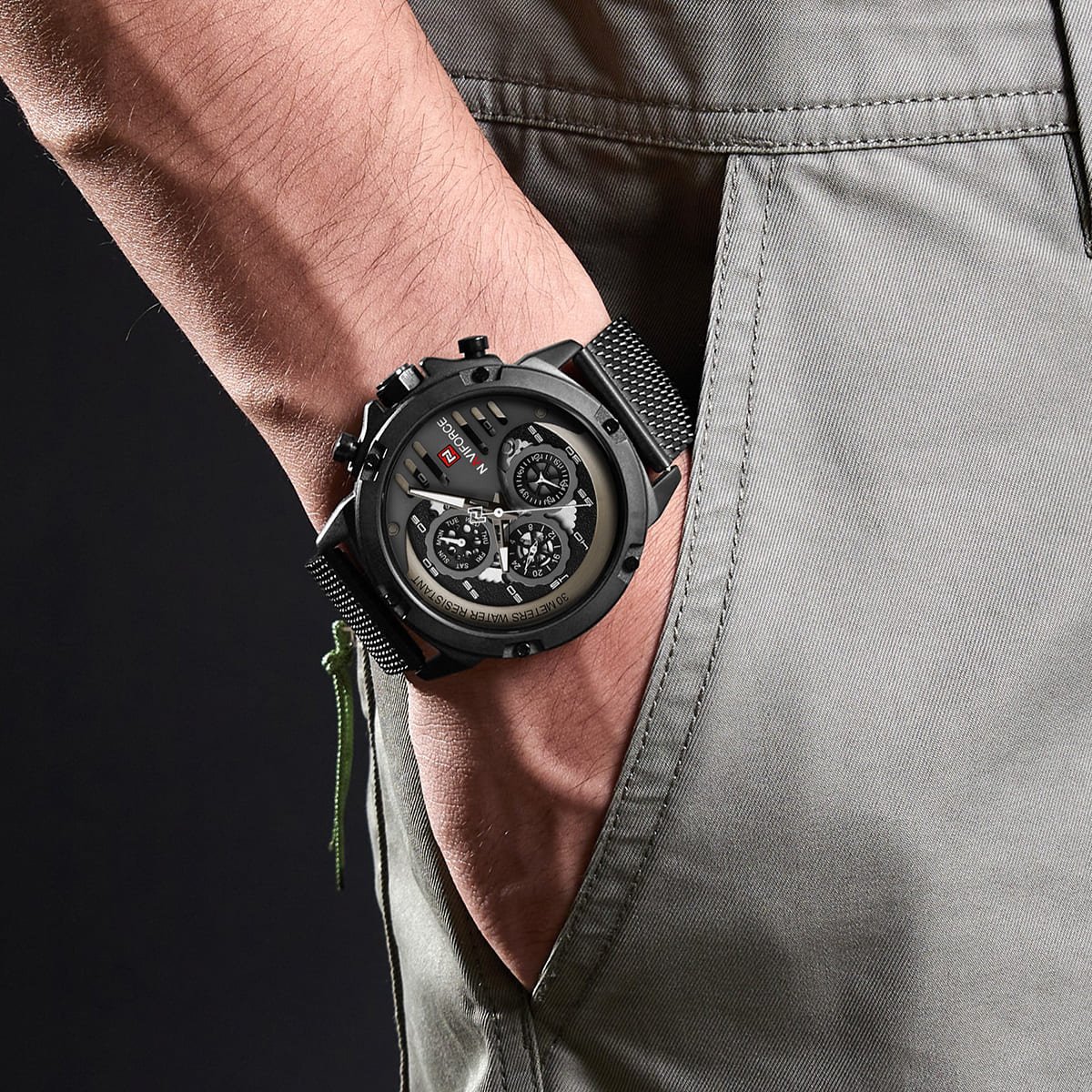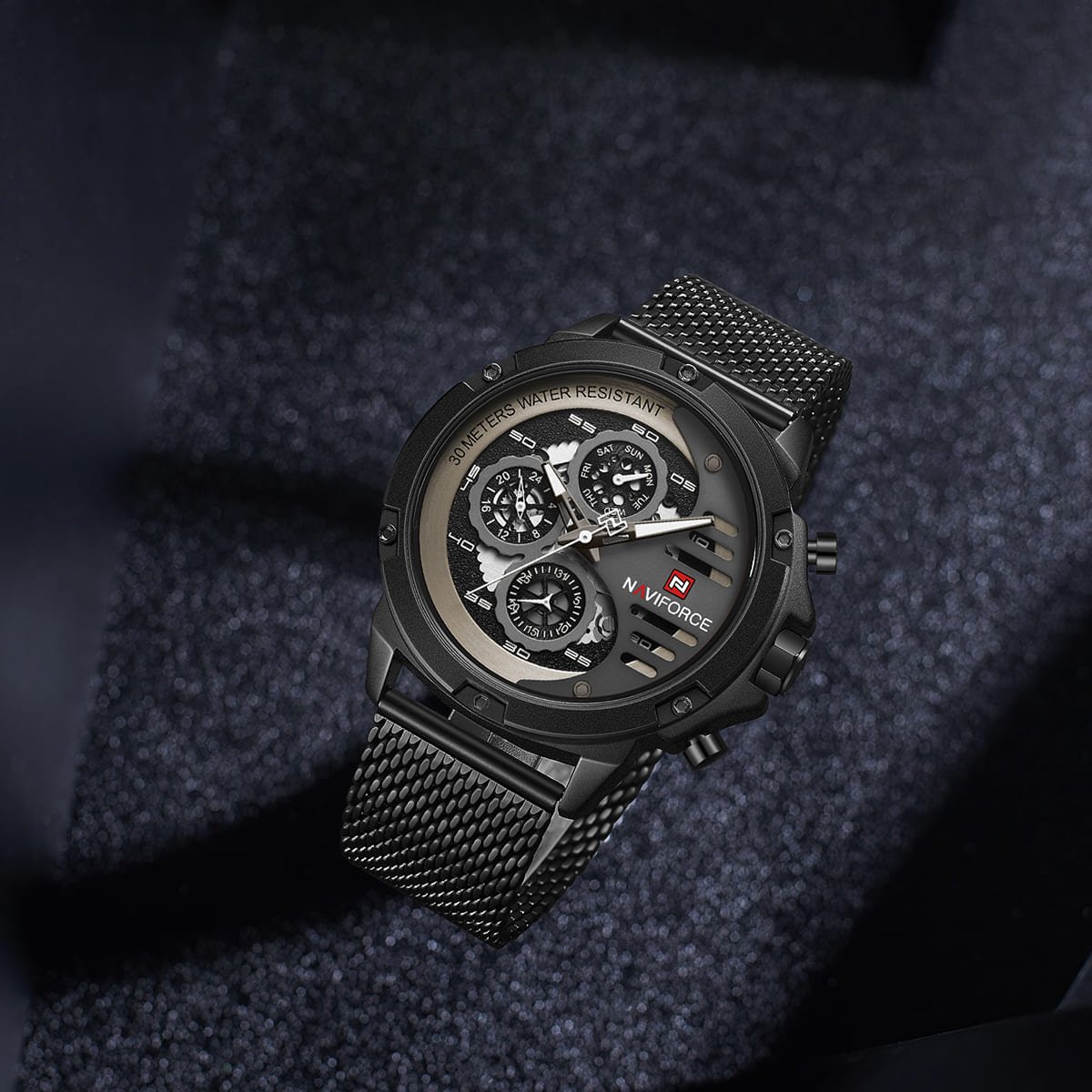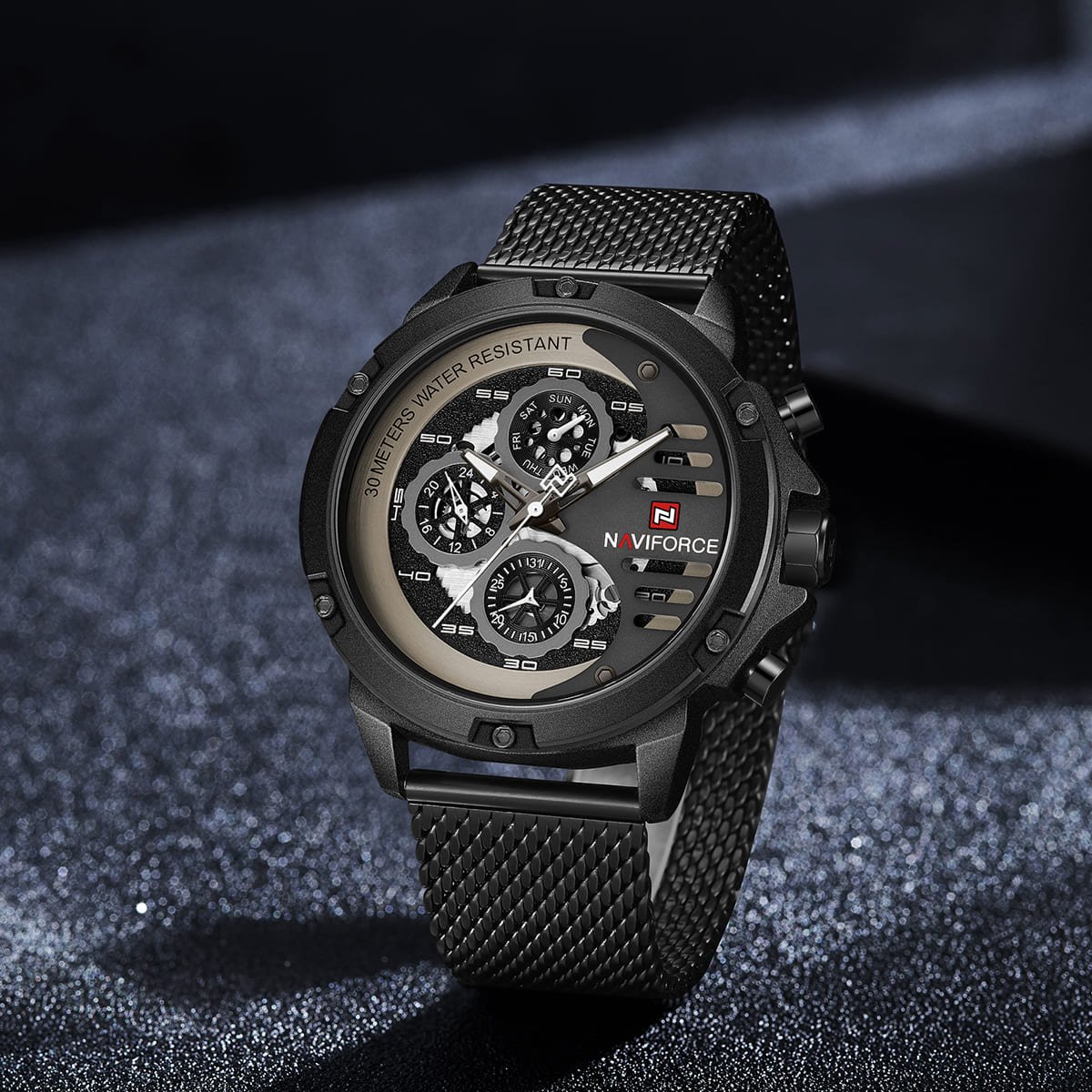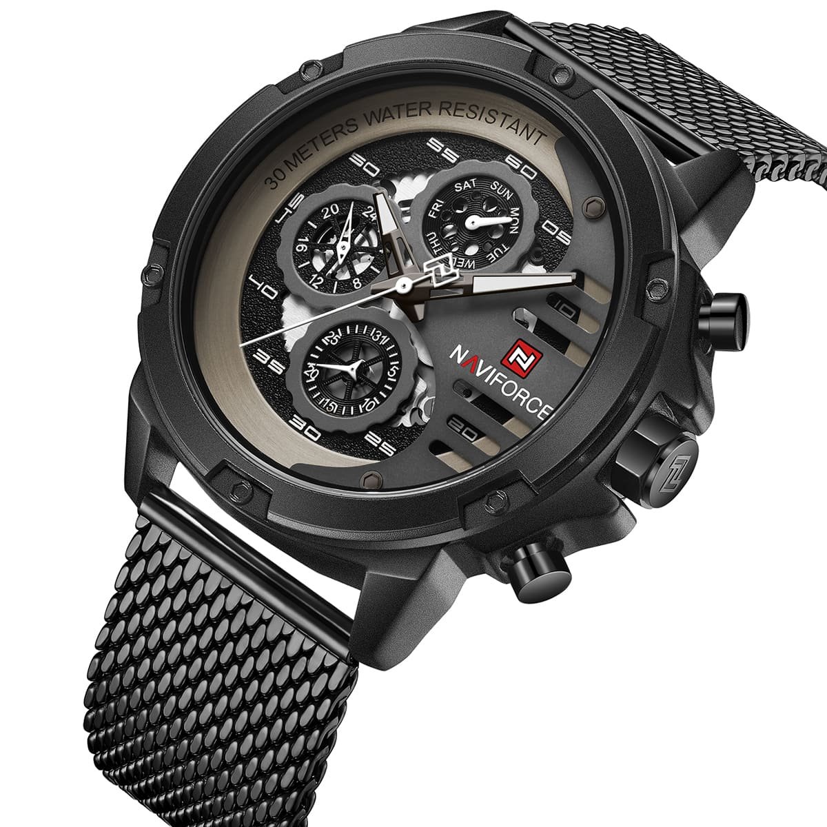 ساعة يد نافي فورس Naviforce NF 9110S B W B رجالي أصلية موديل ( NF9110S ) نظرية 30Meters-Water Resistant بلون اسود و استيك ستانلس ستيل بلون اسودتتميز الساعة بأستيك معدني شبكي مجدُول لتجربة استخدام مريحة ومميزة احصل عليها الآن من SAN CAN للساعات – SAN CAN Watches