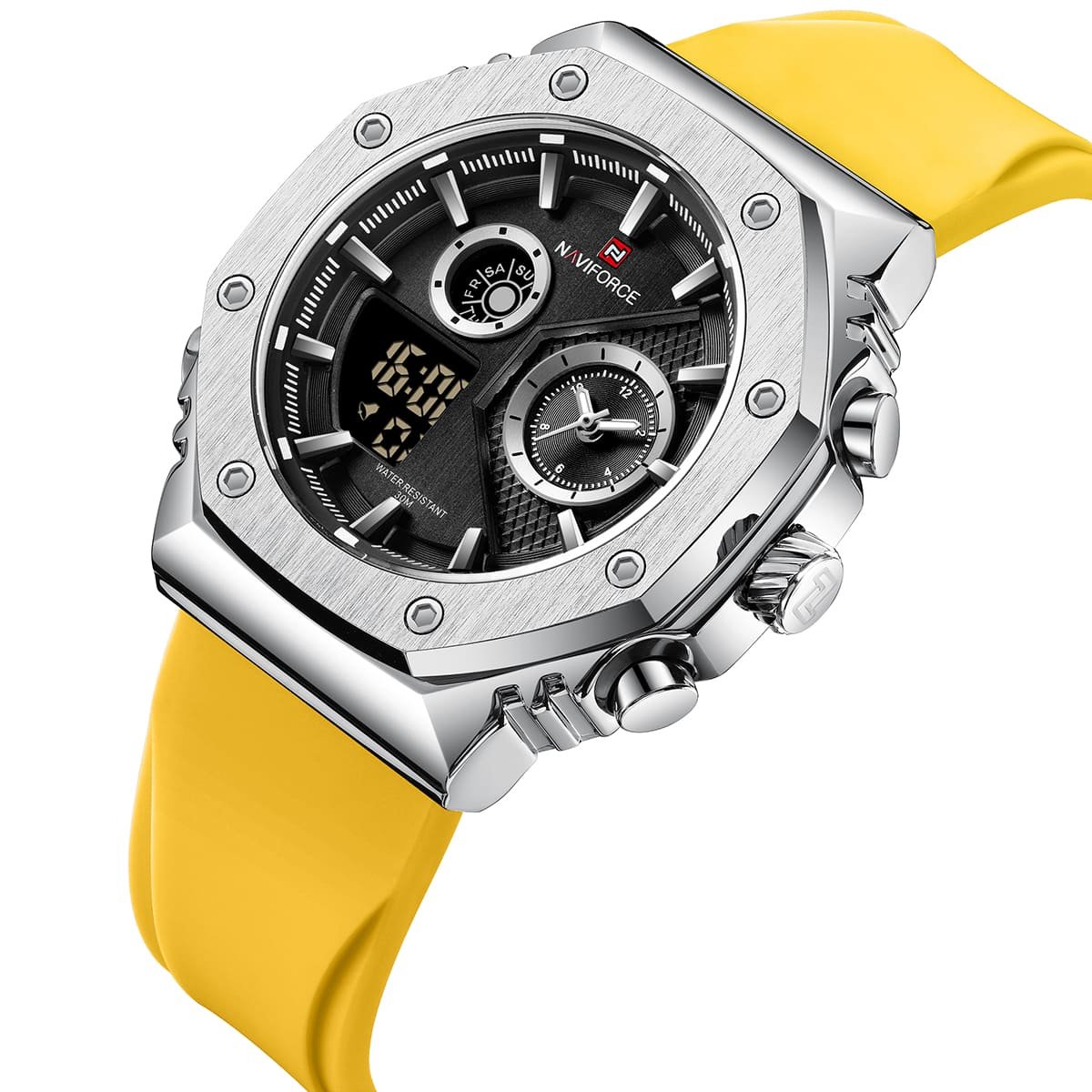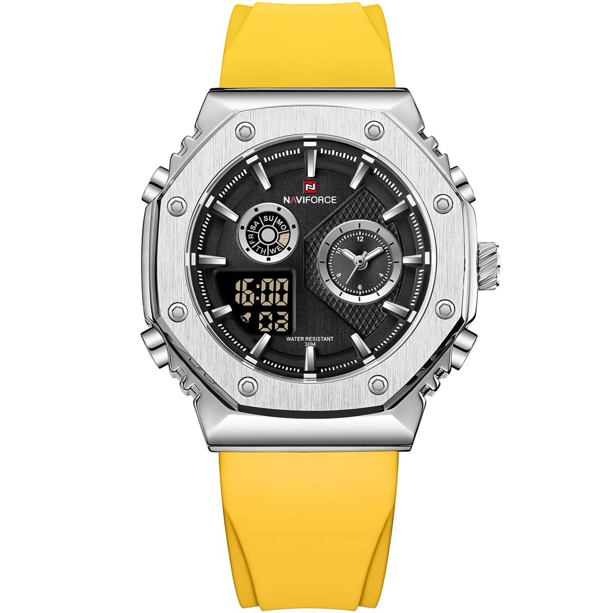 ساعة يد نافي فورس Naviforce NF 9216T S B Y رجالي أصلية موديل ( NF9216T ) نظرية و رقميةبلون مينا اسود و استيك سيليكون مطاط بلون اصفر احصل عليها غدا خلال 24 ساعة داخل القاهرة و الجيزة و الاسكندرية