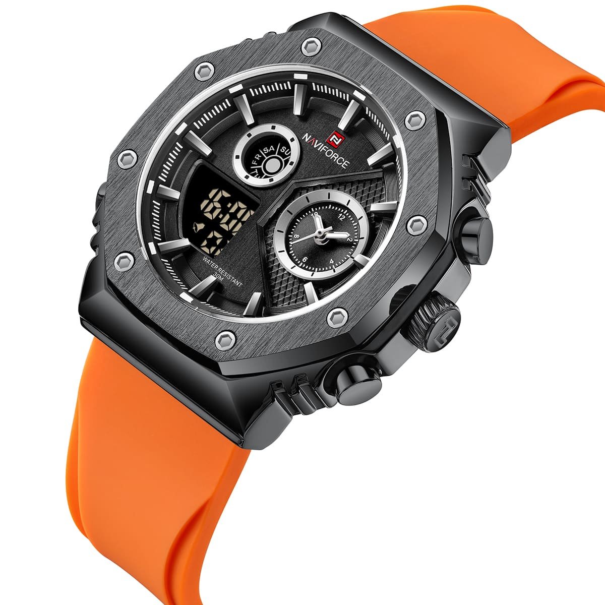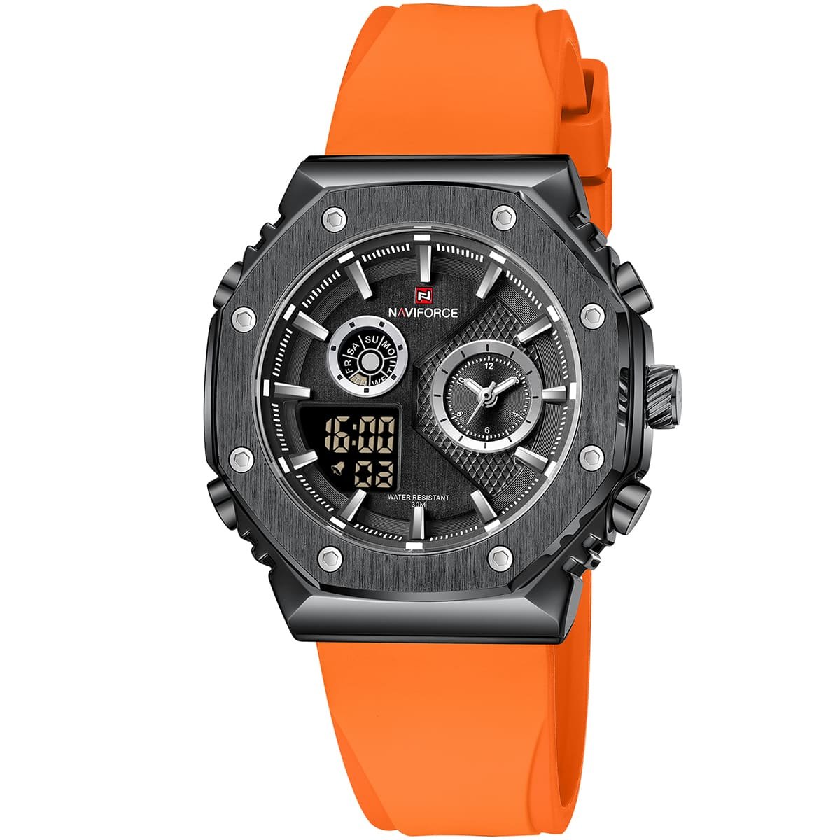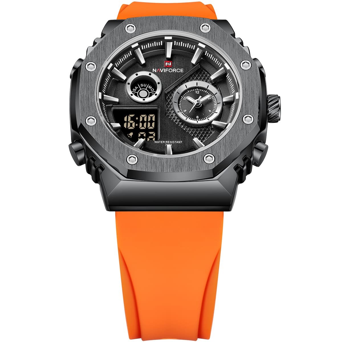 ساعة يد نافي فورس Naviforce NF 9216T B B O رجالي أصلية موديل ( NF9216T ) نظرية و رقميةبلون مينا اسود و استيك سيليكون مطاط بلون برتقالي احصل عليها غدا خلال 24 ساعة داخل القاهرة و الجيزة و الاسكندرية