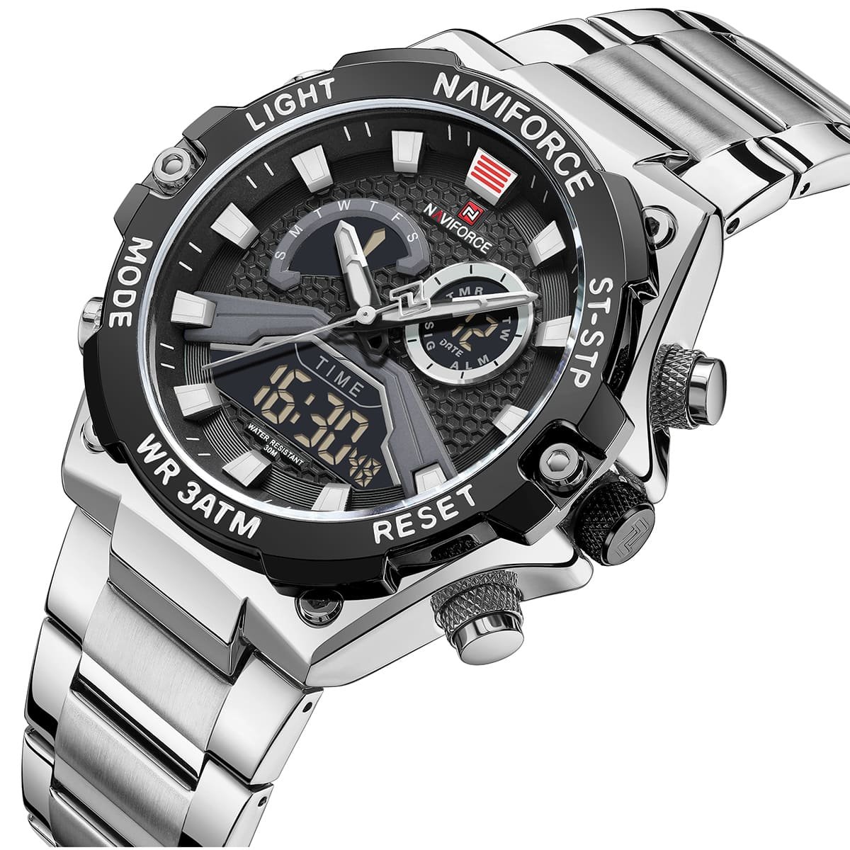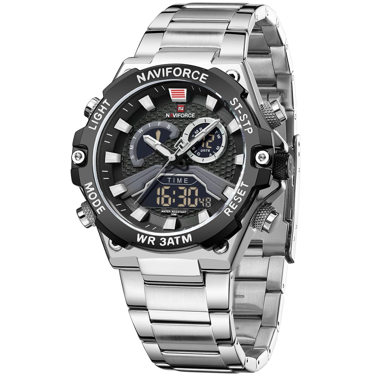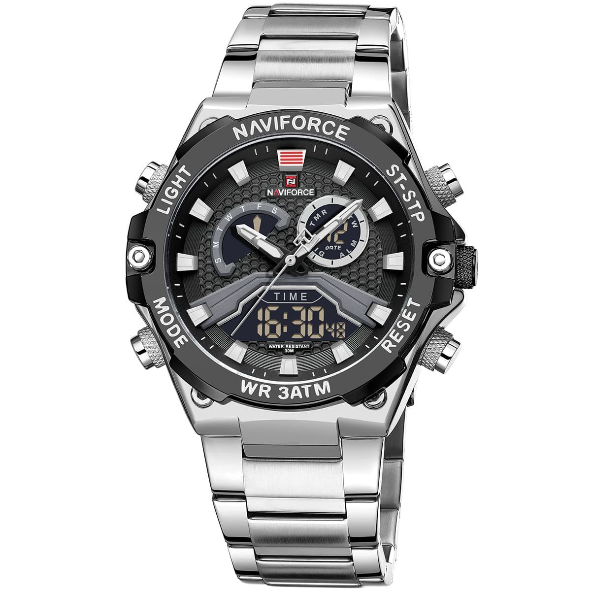 ساعة يد نافي فورس Naviforce NF 9207 S B B رجالي أصلية موديل ( NF9207 ) نظرية و رقميةبلون مينا اسود و استيك معدن بلون فضي احصل عليها غدا خلال 24 ساعة داخل القاهرة و الجيزة و الاسكندرية