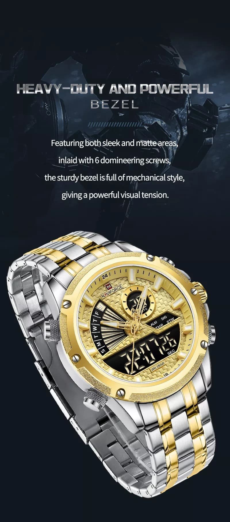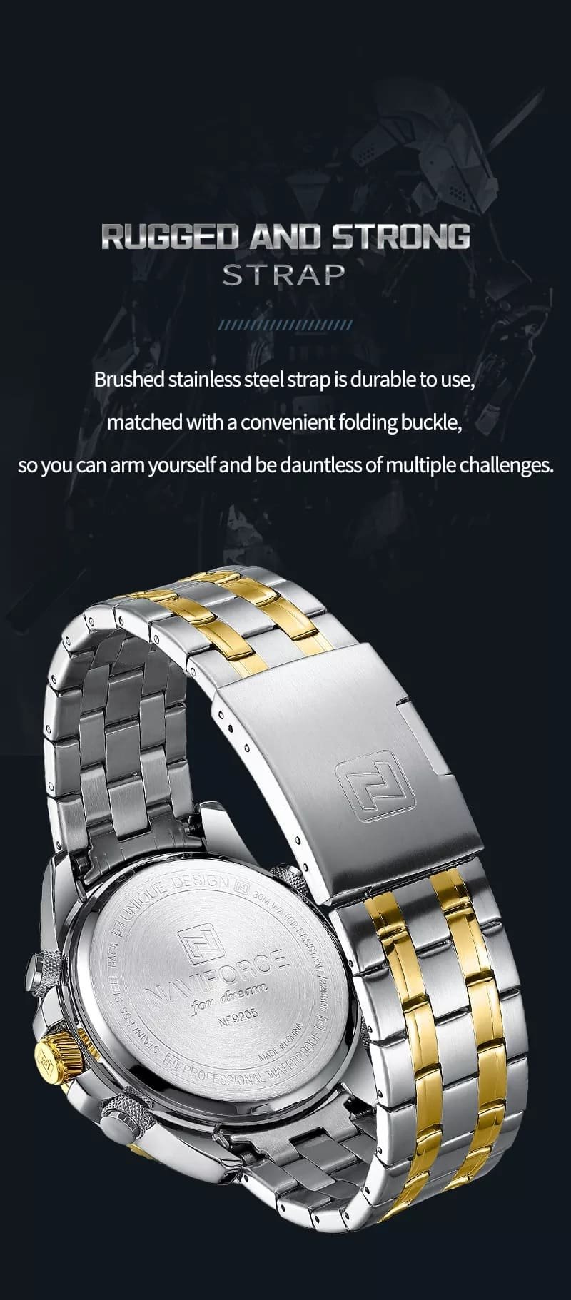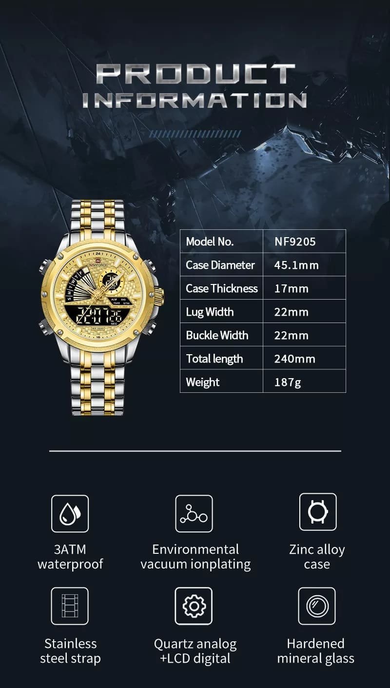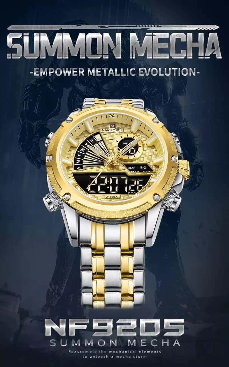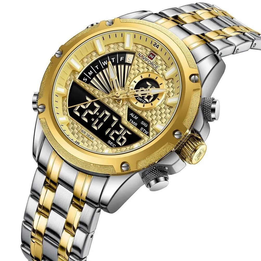 ساعة يد نافي فورس Naviforce NF9205 S G رجالي أصلية موديل ( NF9205 ) نظرية و رقمية بلون مينا ذهبي و استيك معدن بلون فضي و ذهبي احصل عليها غدا خلال 24 ساعة داخل القاهرة و الجيزة و الاسكندرية