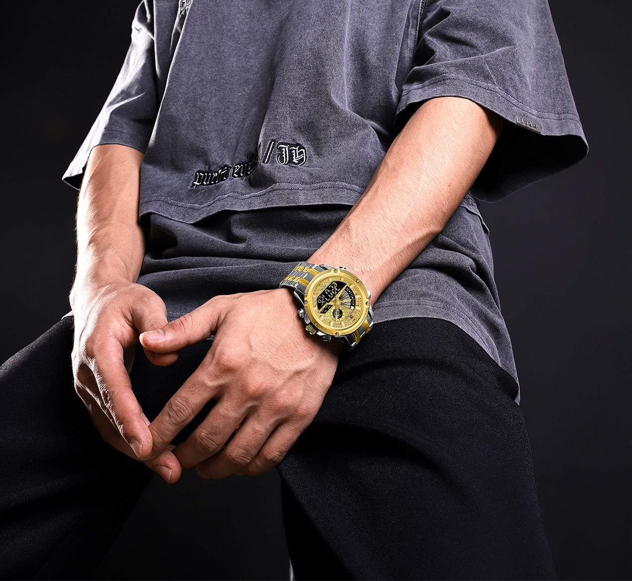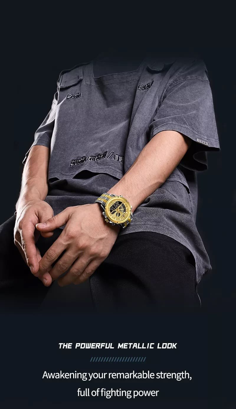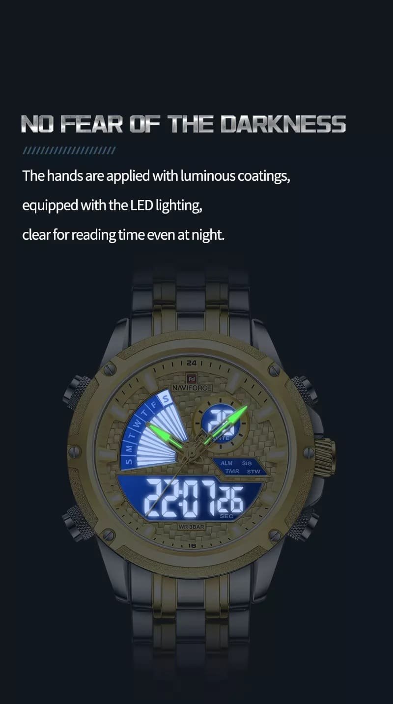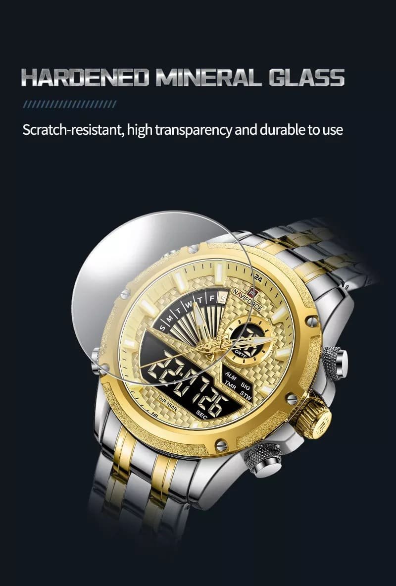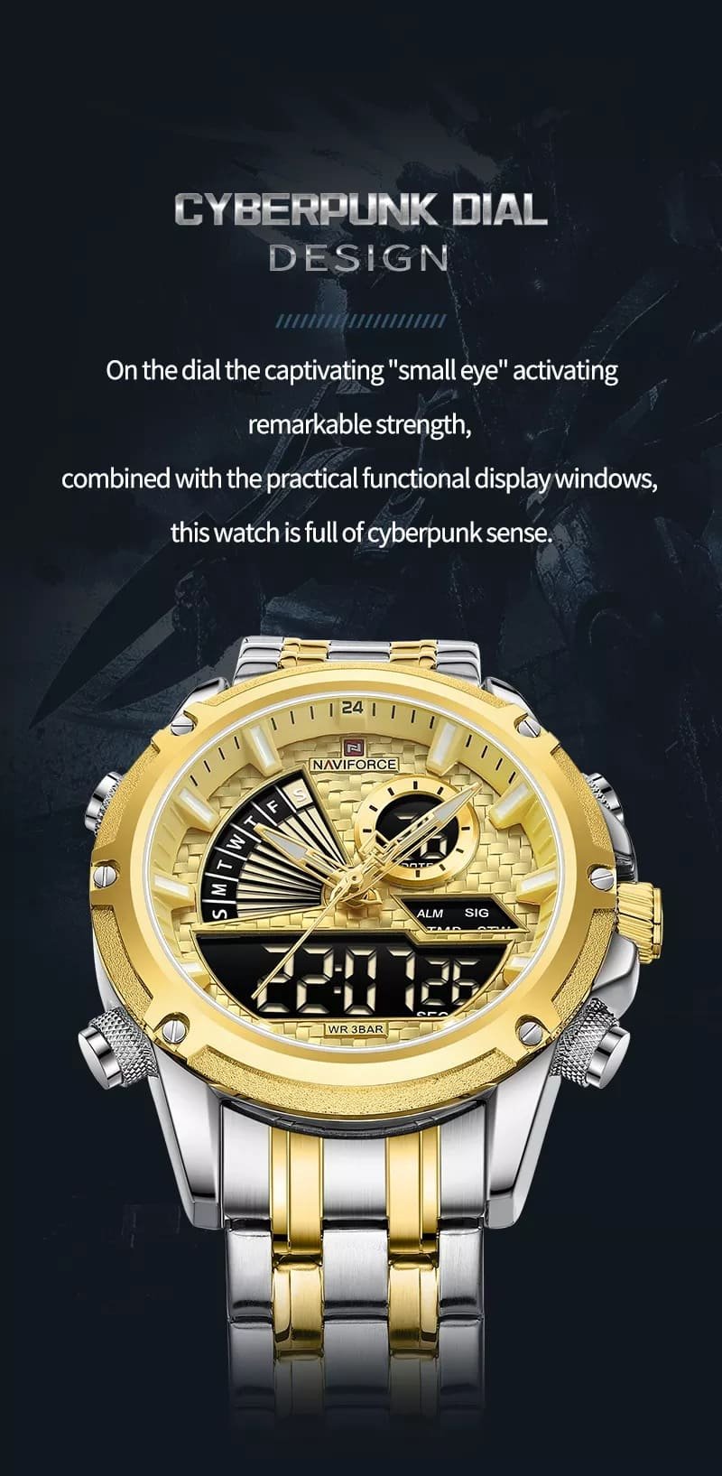 ساعة يد نافي فورس Naviforce NF9205 S G رجالي أصلية موديل ( NF9205 ) نظرية و رقمية بلون مينا ذهبي و استيك معدن بلون فضي و ذهبي احصل عليها غدا خلال 24 ساعة داخل القاهرة و الجيزة و الاسكندرية