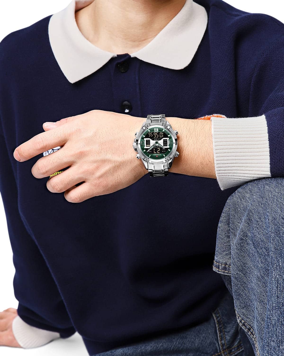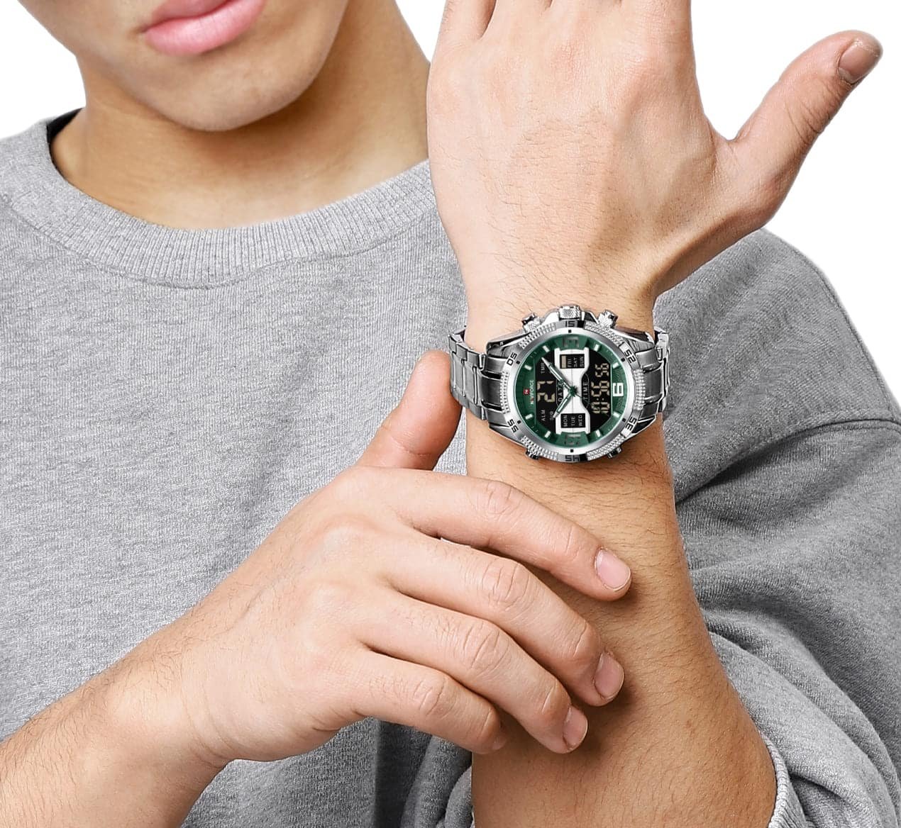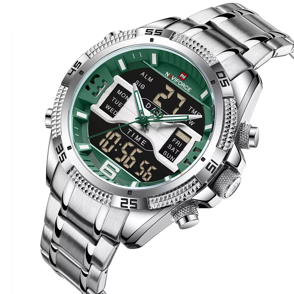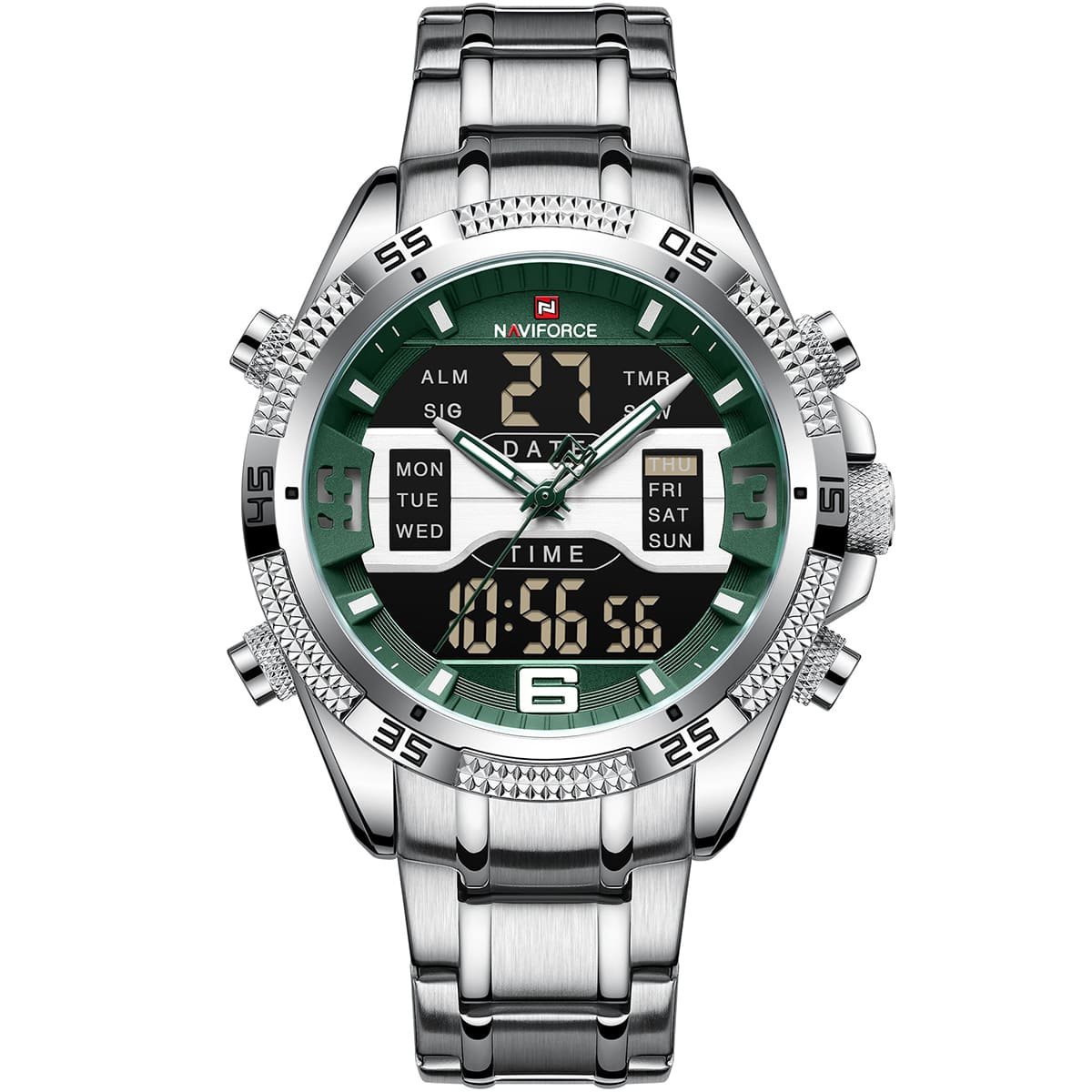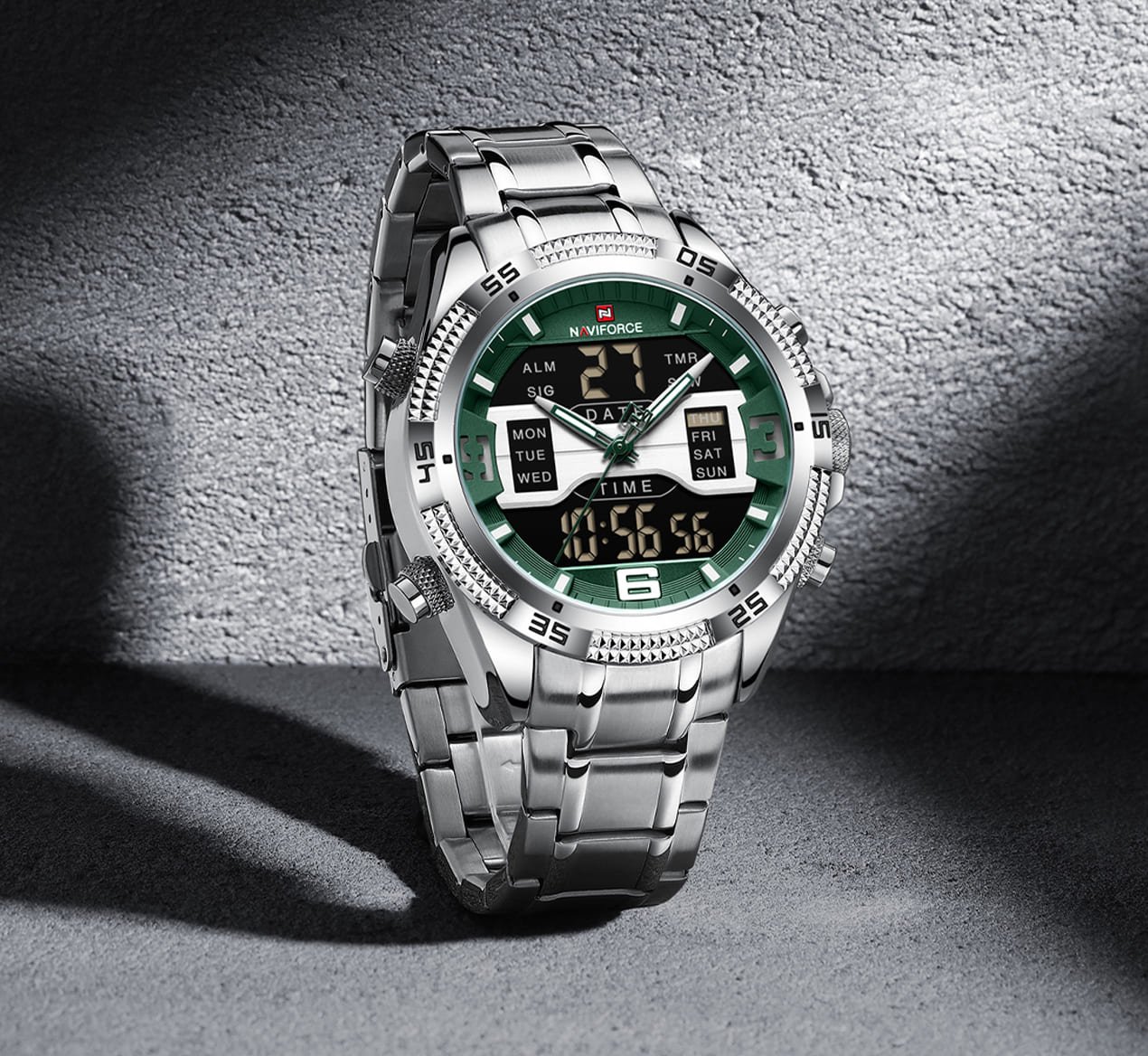 ساعة يد نافي فورس Naviforce NF9201 S GN رجالي أصلية موديل ( NF9201 ) نظرية و رقمية بلون مينا اخضر و استيك معدن بلون فضي احصل عليها غدا خلال 24 ساعة داخل القاهرة و الجيزة و الاسكندرية
