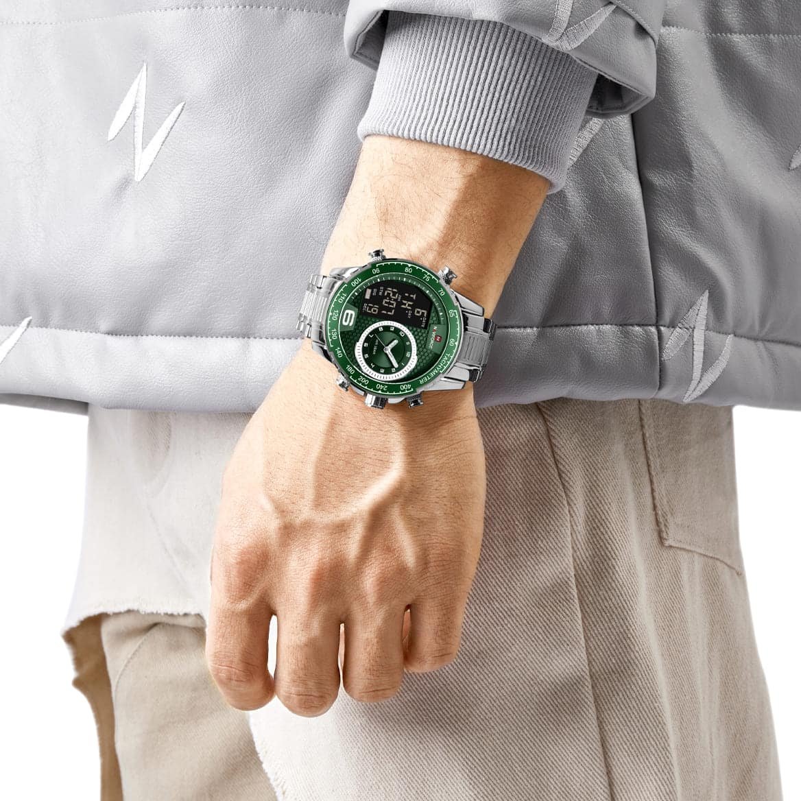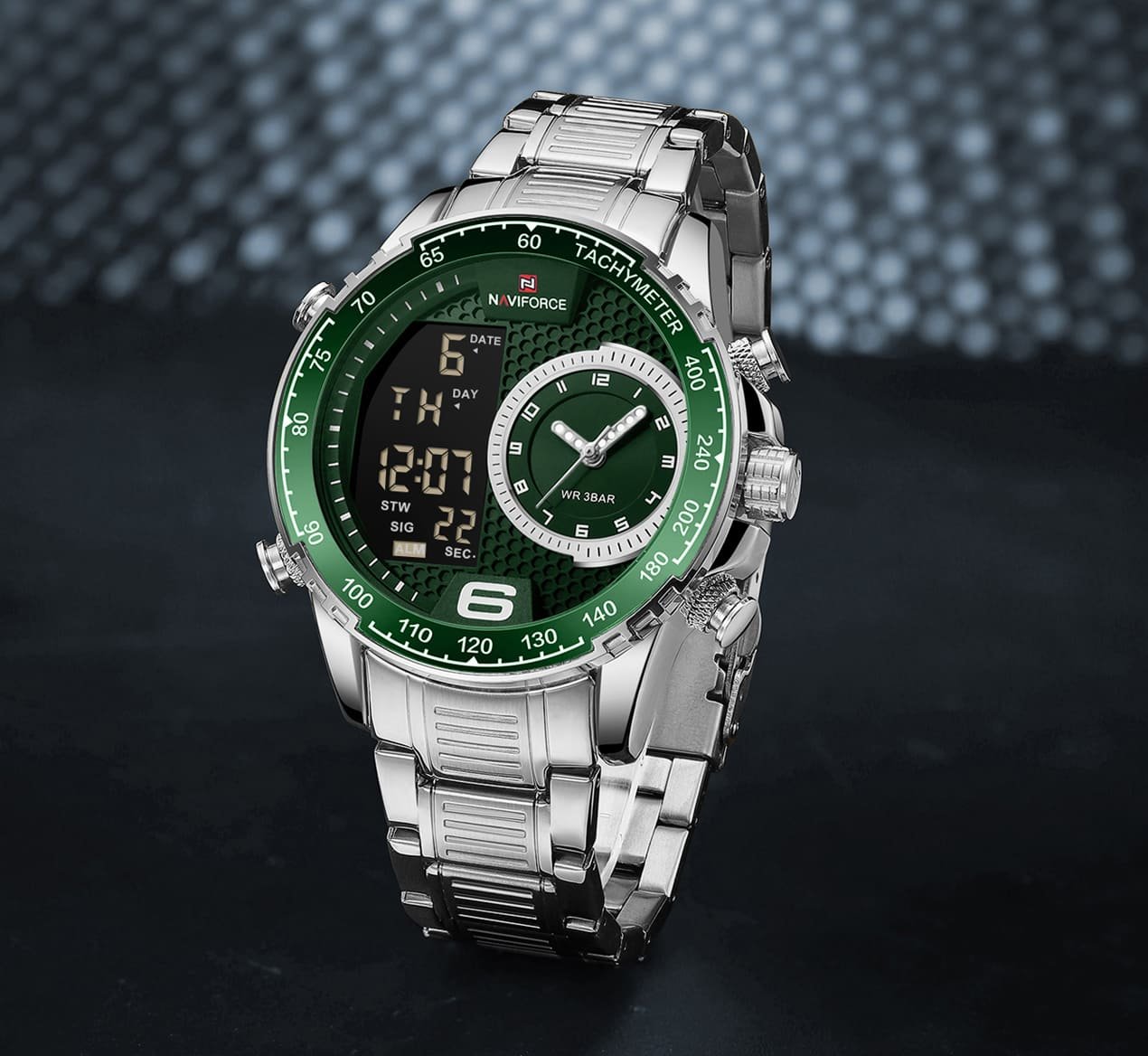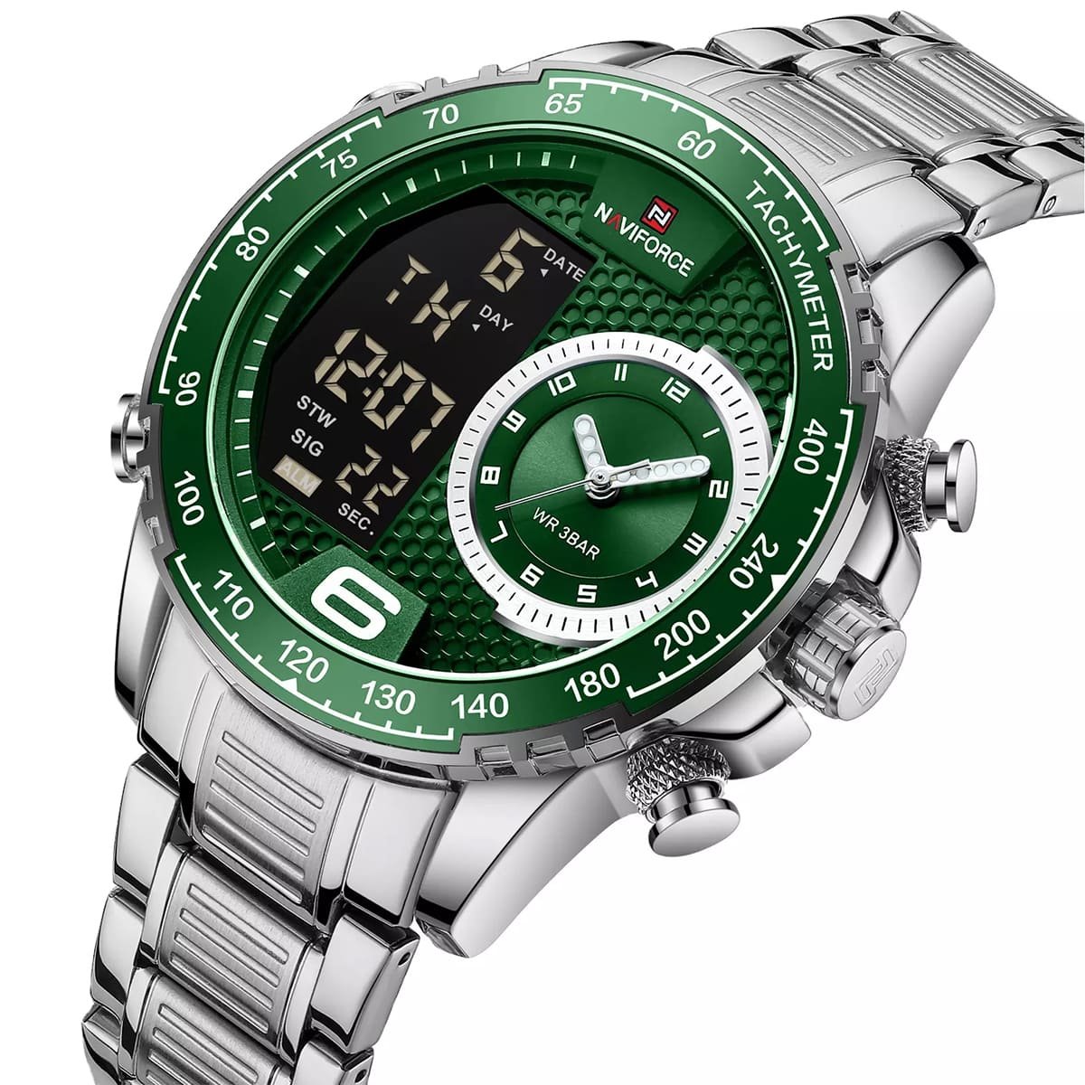 ساعة يد نافي فورس Naviforce NF9199S S GN رجالي أصلية موديل ( NF9199S ) نظرية و رقمية بلون مينا اخضر و استيك معدن بلون فضي احصل عليها غدا خلال 24 ساعة داخل القاهرة و الجيزة و الاسكندرية