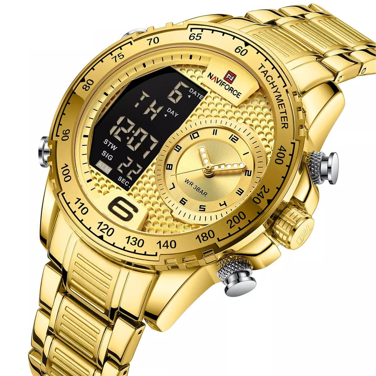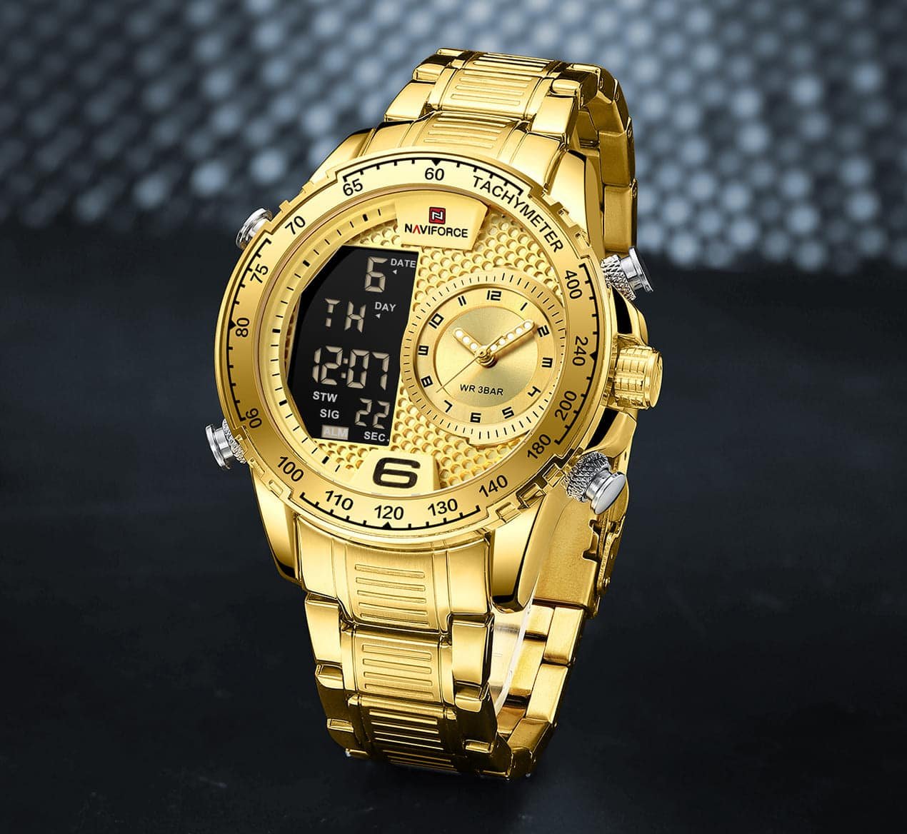 ساعة يد نافي فورس Naviforce NF9199S G G رجالي أصلية موديل ( NF9199S ) نظرية و رقمية بلون مينا ذهبي و استيك معدن بلون ذهبي احصل عليها غدا خلال 24 ساعة داخل القاهرة و الجيزة و الاسكندرية