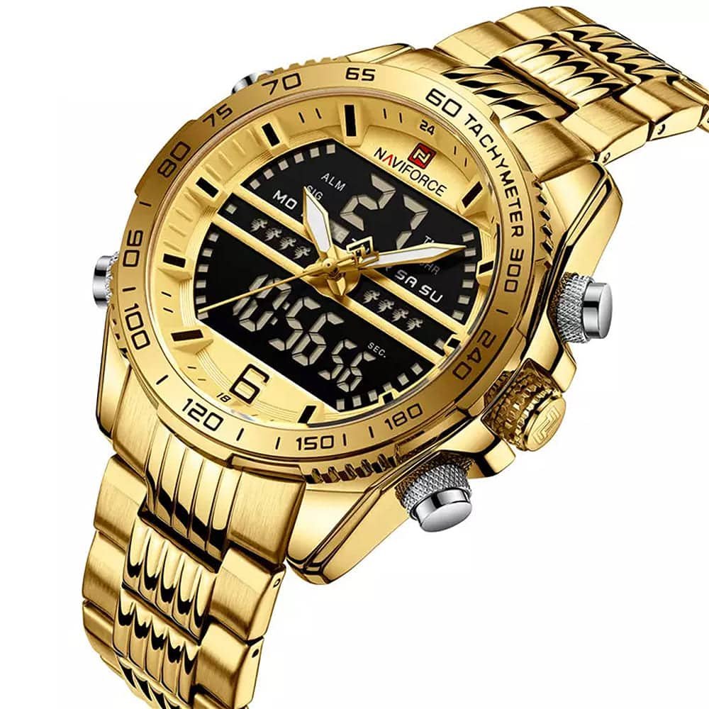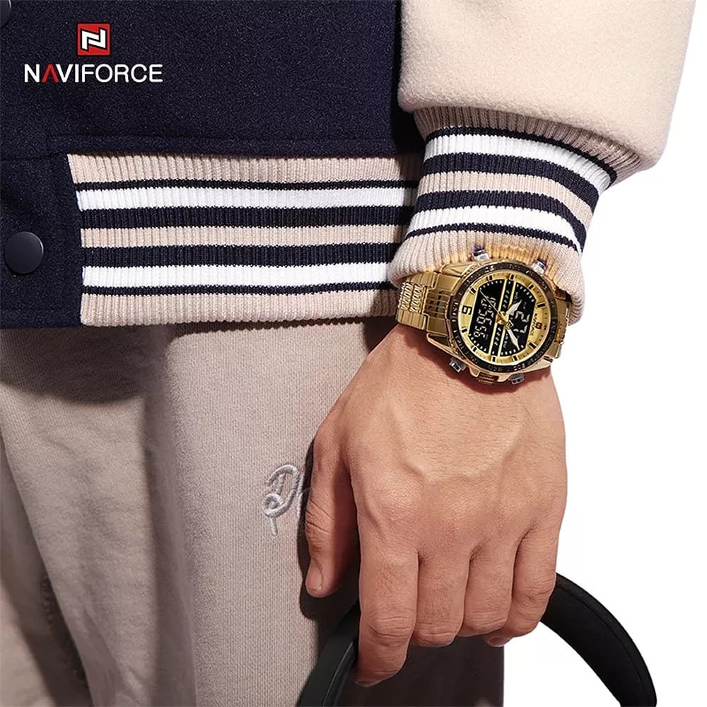 ساعة يد نافي فورس Naviforce NF9195S G G G رجالي أصلية موديل ( NF9195S ) نظرية و رقمية بلون مينا ذهبي و استيك معدن بلون ذهبي احصل عليها غدا خلال 24 ساعة داخل القاهرة و الجيزة و الاسكندرية