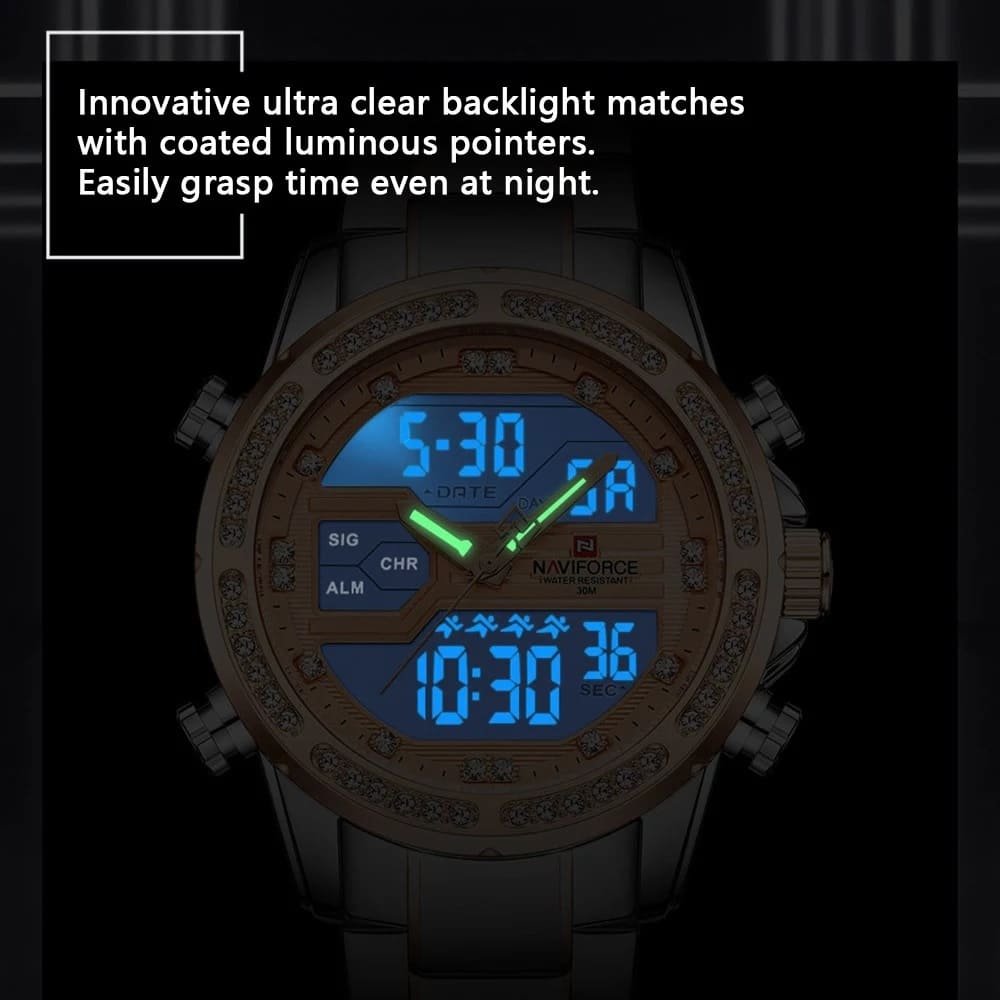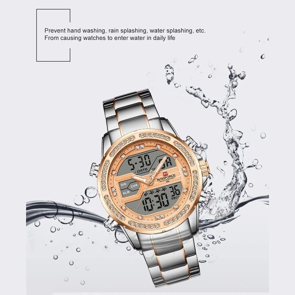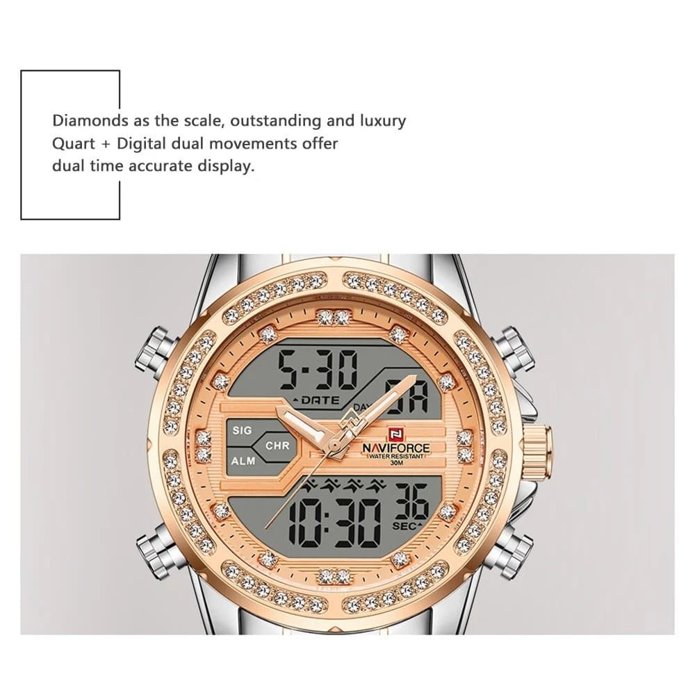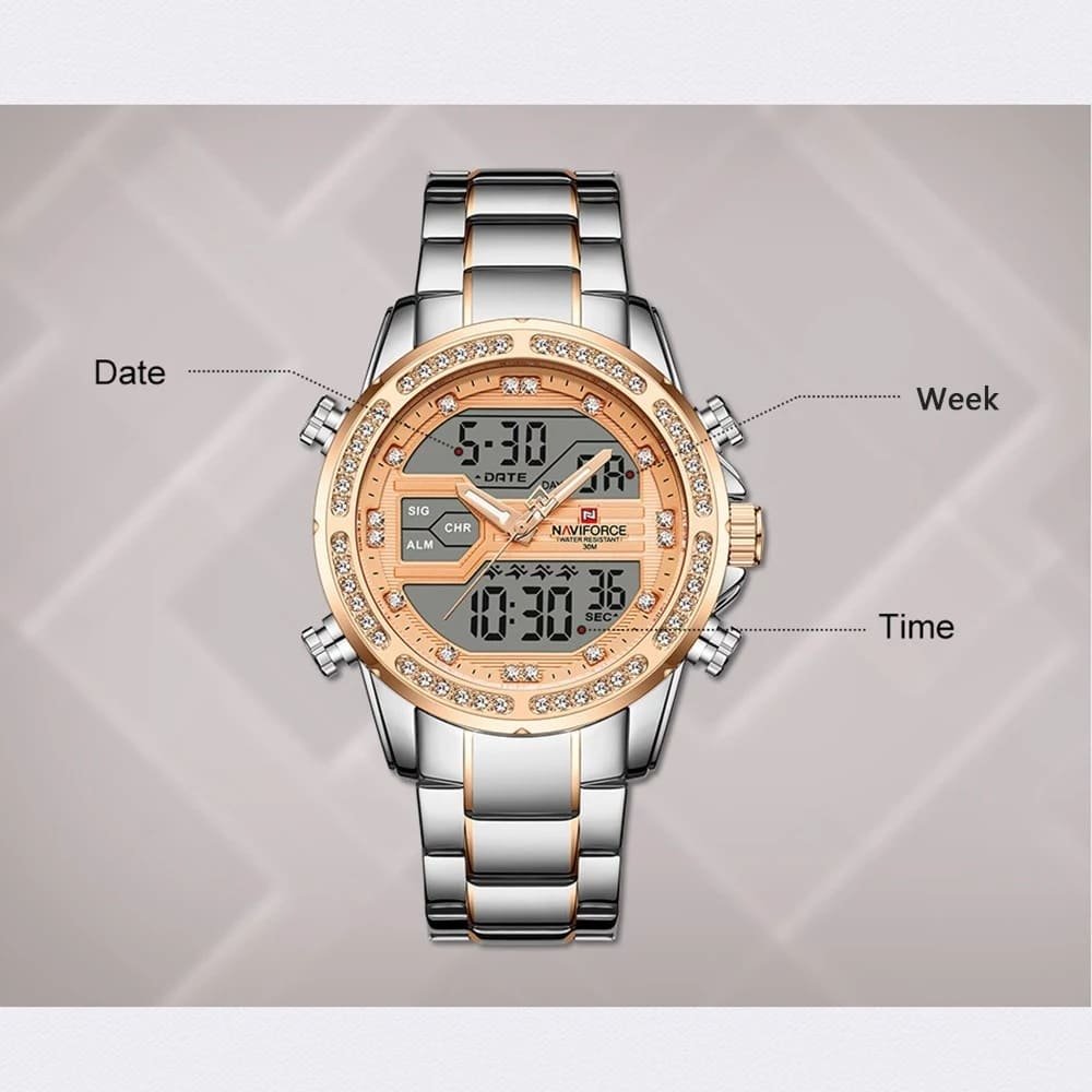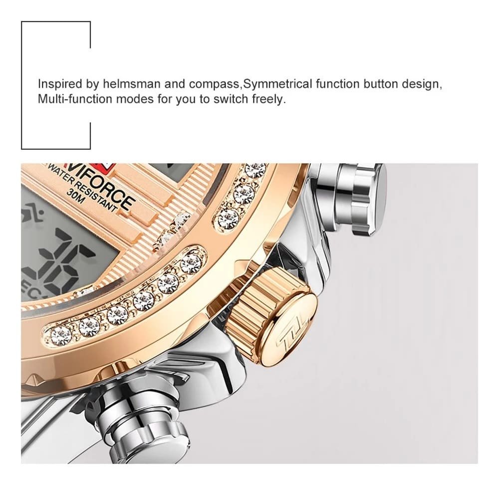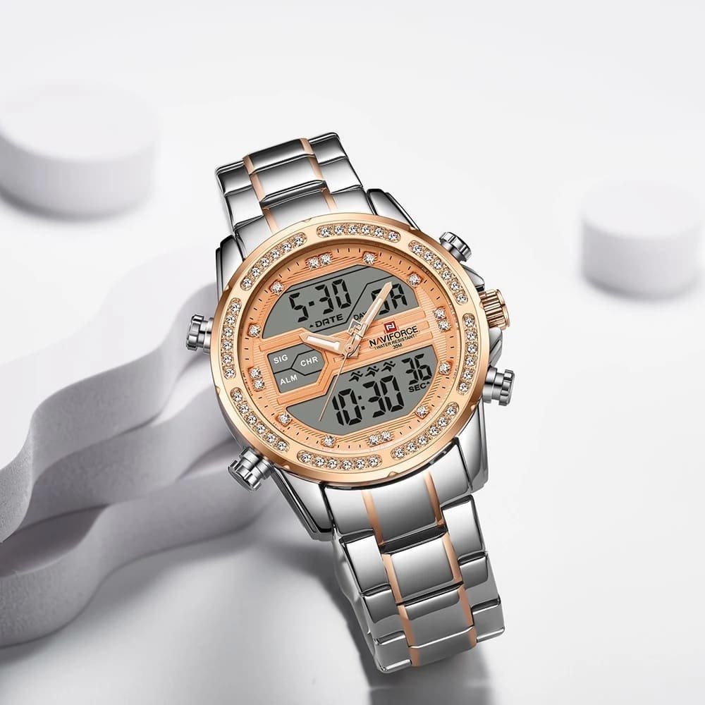 ساعة يد نافي فورس Naviforce NF9190 S RG رجالي أصلية موديل ( NF9190 ) نظرية و رقمية بلون مينا نحاسي و استيك معدن بلون فضي و نحاسي احصل عليها غدا خلال 24 ساعة داخل القاهرة و الجيزة و الاسكندرية