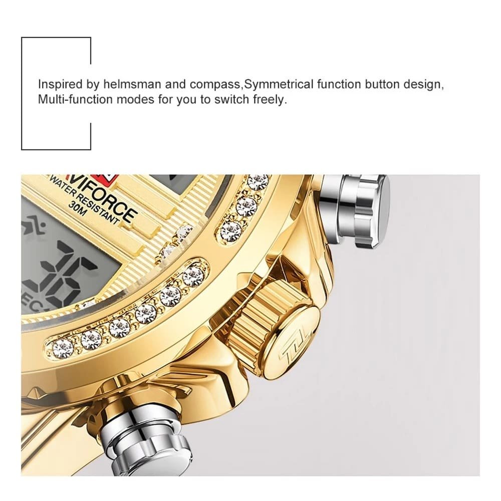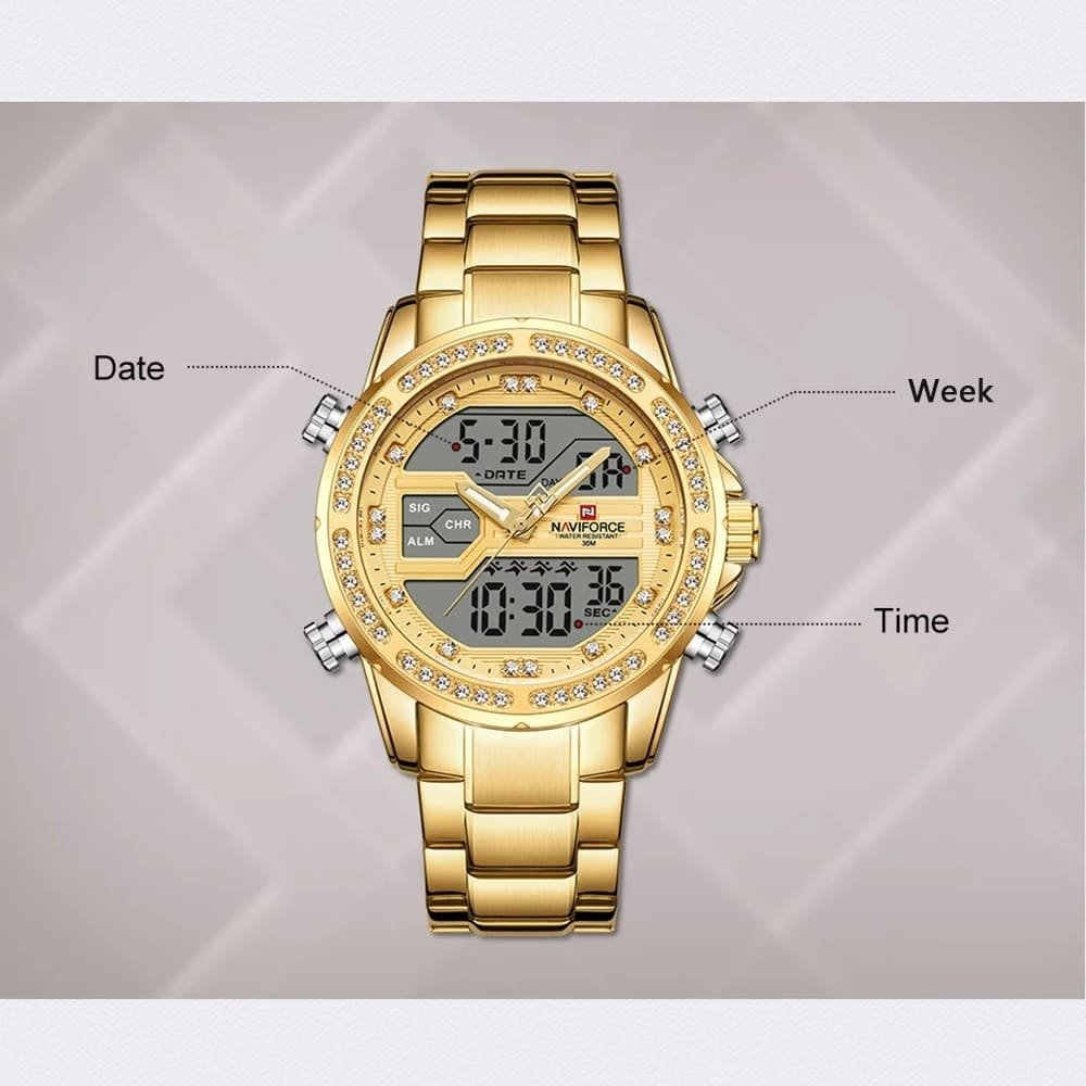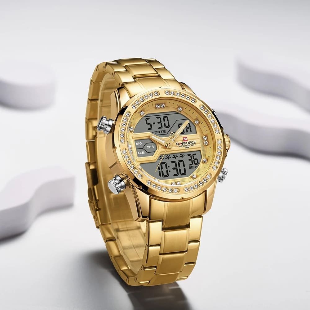 ساعة يد نافي فورس Naviforce NF9190 G G رجالي أصلية موديل ( NF9190 ) نظرية و رقمية بلون مينا ذهبي و استيك معدن بلون ذهبي احصل عليها غدا خلال 24 ساعة داخل القاهرة و الجيزة و الاسكندرية