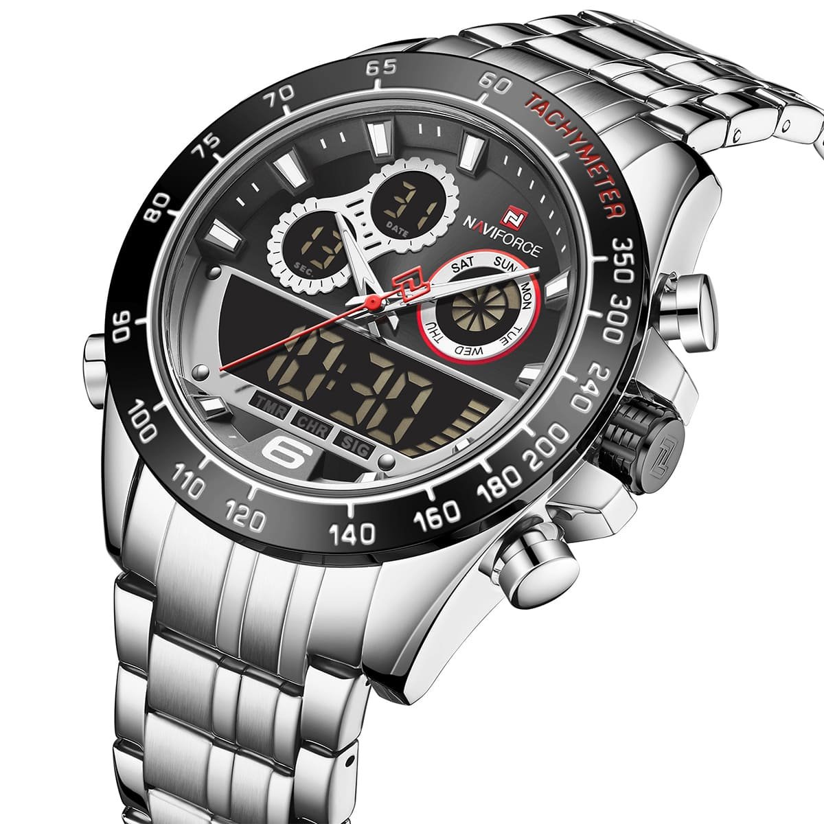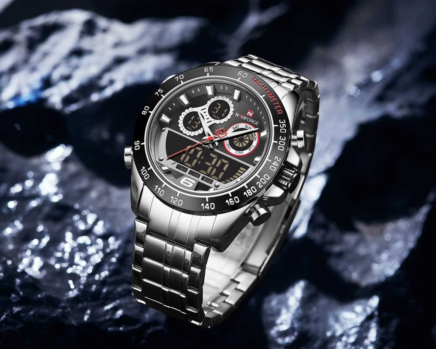 ساعة يد نافي فورس Naviforce NF9188 S B S رجالي أصلية موديل ( NF9188 ) نظرية و رقمية بلون مينا اسود و استيك معدن بلون فضي احصل عليها غدا خلال 24 ساعة داخل القاهرة و الجيزة و الاسكندرية
