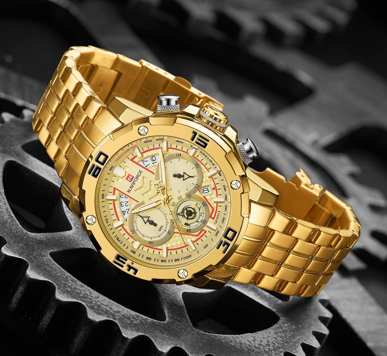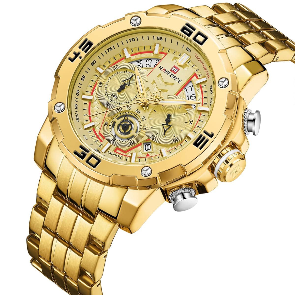 ساعة يد نافي فورس Naviforce NF9175 G G رجالي أصلية موديل ( NF9175 ) نظريةبلون مينا ذهبي و استيك معدن بلون ذهبي احصل عليها غدا خلال 24 ساعة داخل القاهرة و الجيزة و الاسكندرية