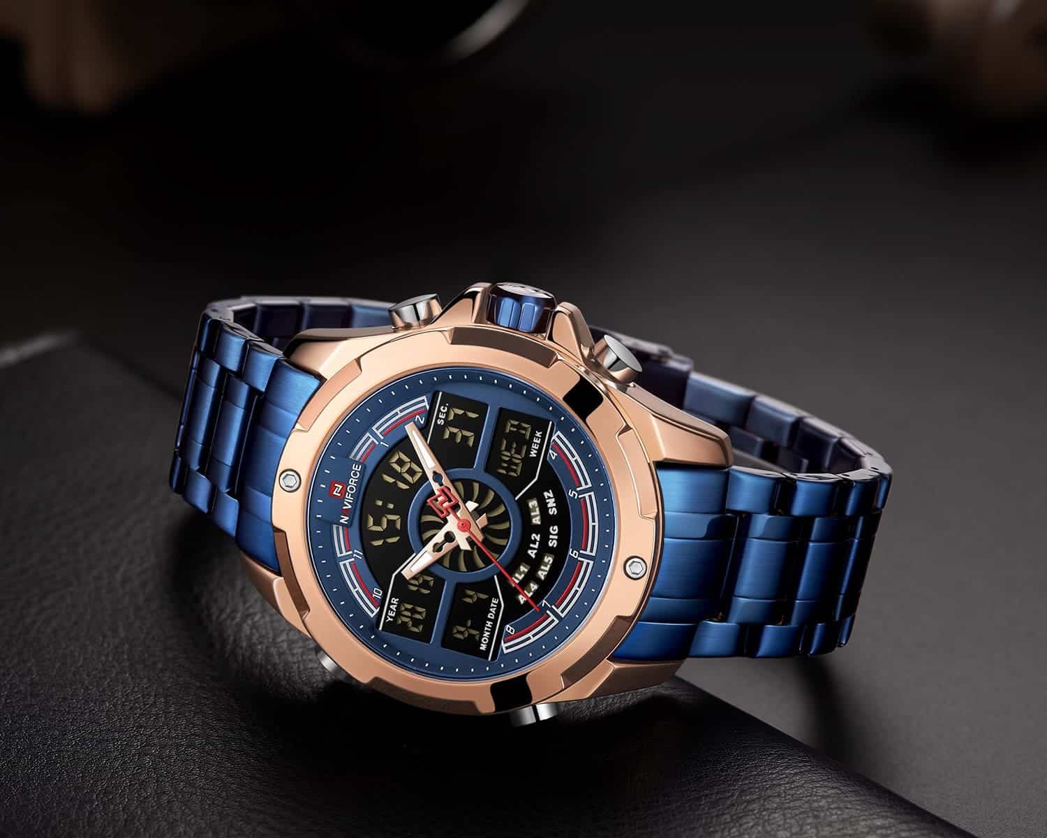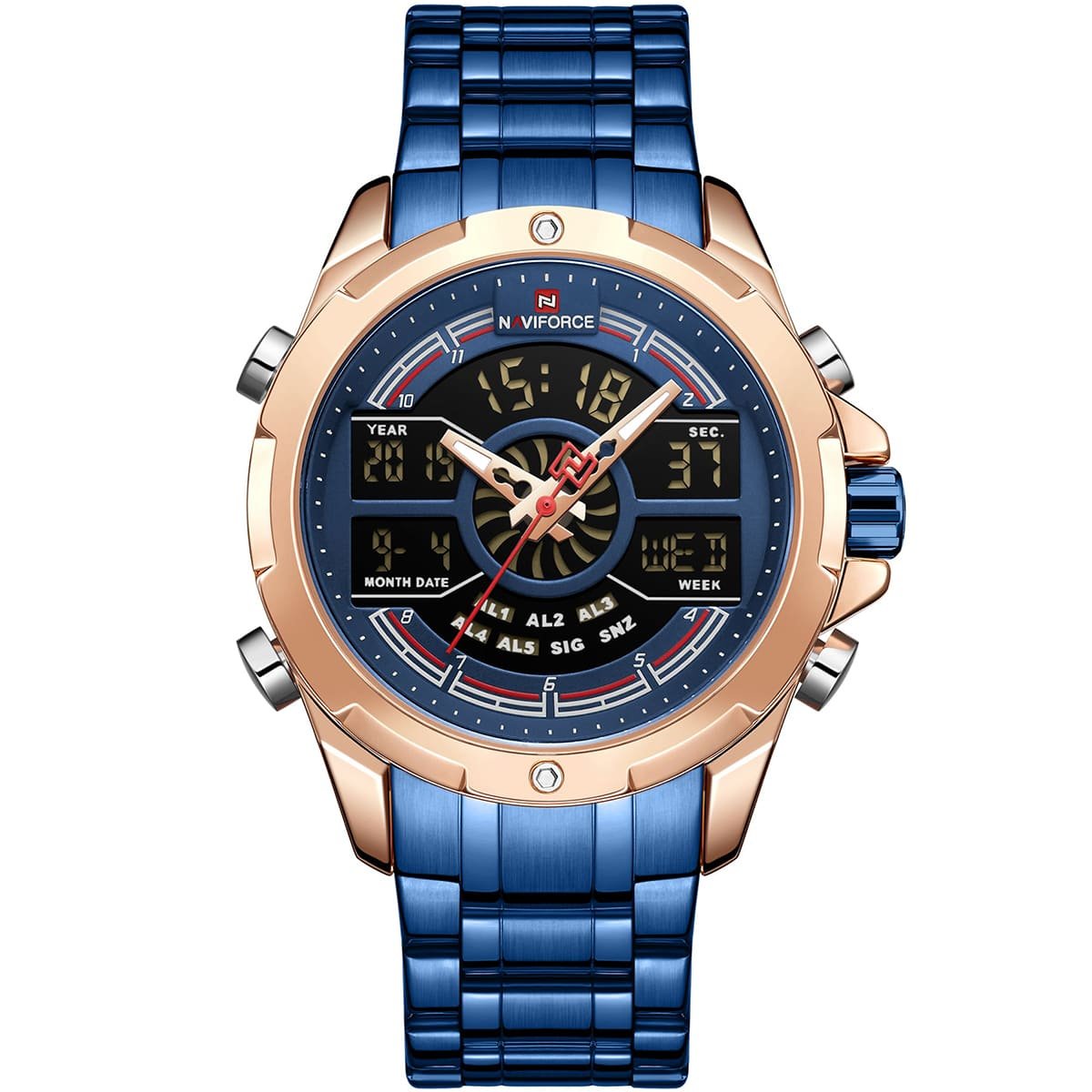 ساعة يد نافي فورس Naviforce NF9170 RG BE رجالي أصلية موديل ( NF9170 ) نظرية و رقمية بلون مينا ازرق و استيك معدن بلون ازرق احصل عليها غدا خلال 24 ساعة داخل القاهرة و الجيزة و الاسكندرية