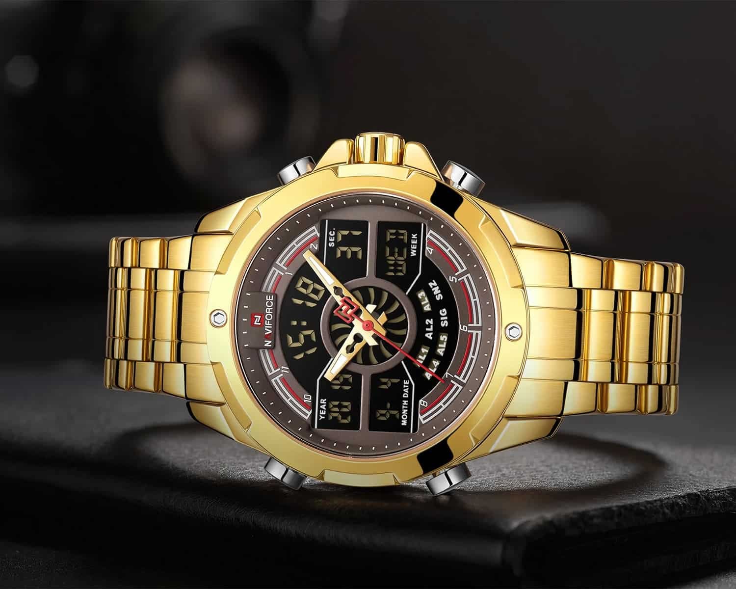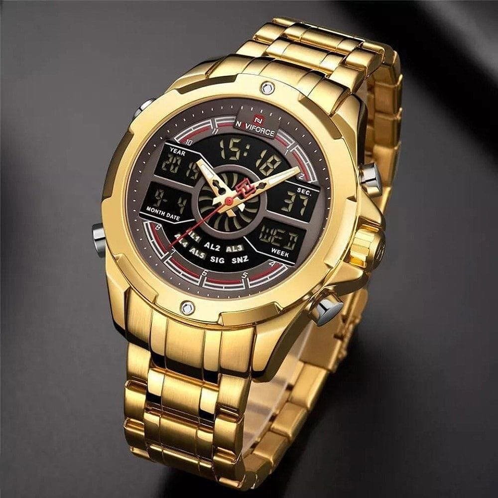 ساعة يد نافي فورس Naviforce NF9170 G CE رجالي أصلية موديل ( NF9170 ) نظرية و رقمية بلون مينا بني غامق و استيك معدن بلون ذهبي احصل عليها غدا خلال 24 ساعة داخل القاهرة و الجيزة و الاسكندرية