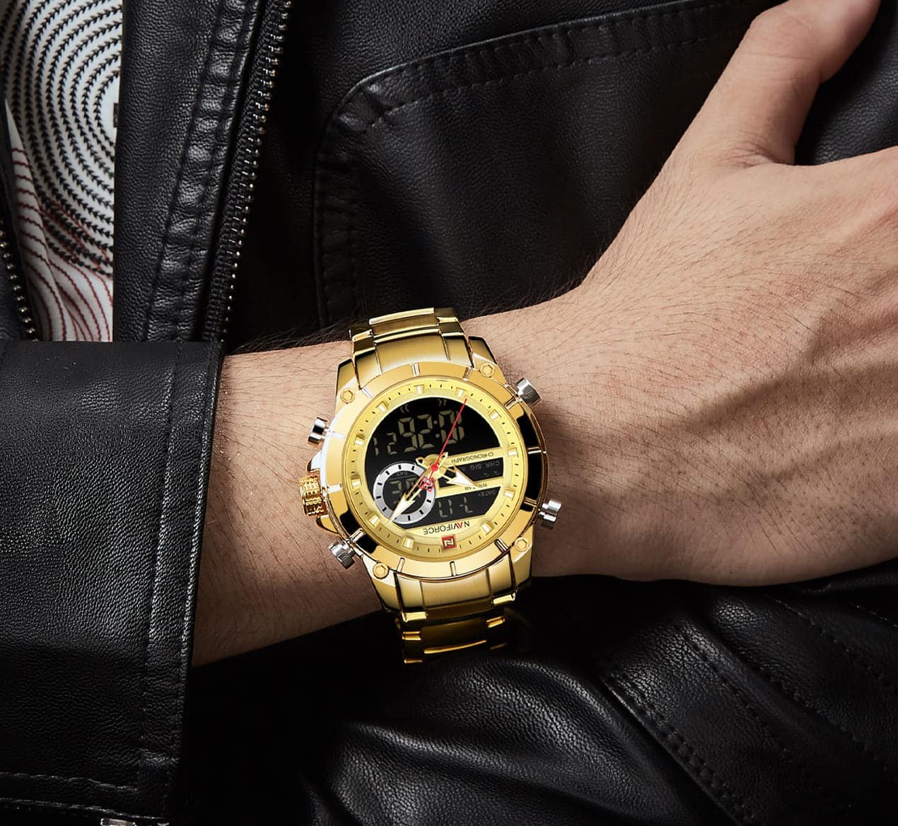 ساعة يد نافي فورس Naviforce NF9163 G G رجالي أصلية موديل ( NF9163 ) نظرية و رقميةبلون مينا ذهبي و استيك معدن بلون ذهبي احصل عليها غدا خلال 24 ساعة داخل القاهرة و الجيزة و الاسكندرية